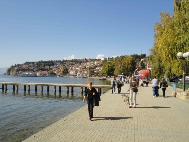 In Ohrid (stadje op de Unesco lijst werelderfgoed) parkeren we de auto en lopen de boulevard aan het meer op. Ondanks het zonnetje en de temperatuur van ruim 20 graden is bijna iedereen in winterkleding. Hoge laarzen, panty’s, truien… Of een korte broek met een panty eronder…. Rrrrrrrrr, Je pikt de toeristen er zo uit. Die lopen lekker in korte broek (zonder panty) en tshirt, wij ook.