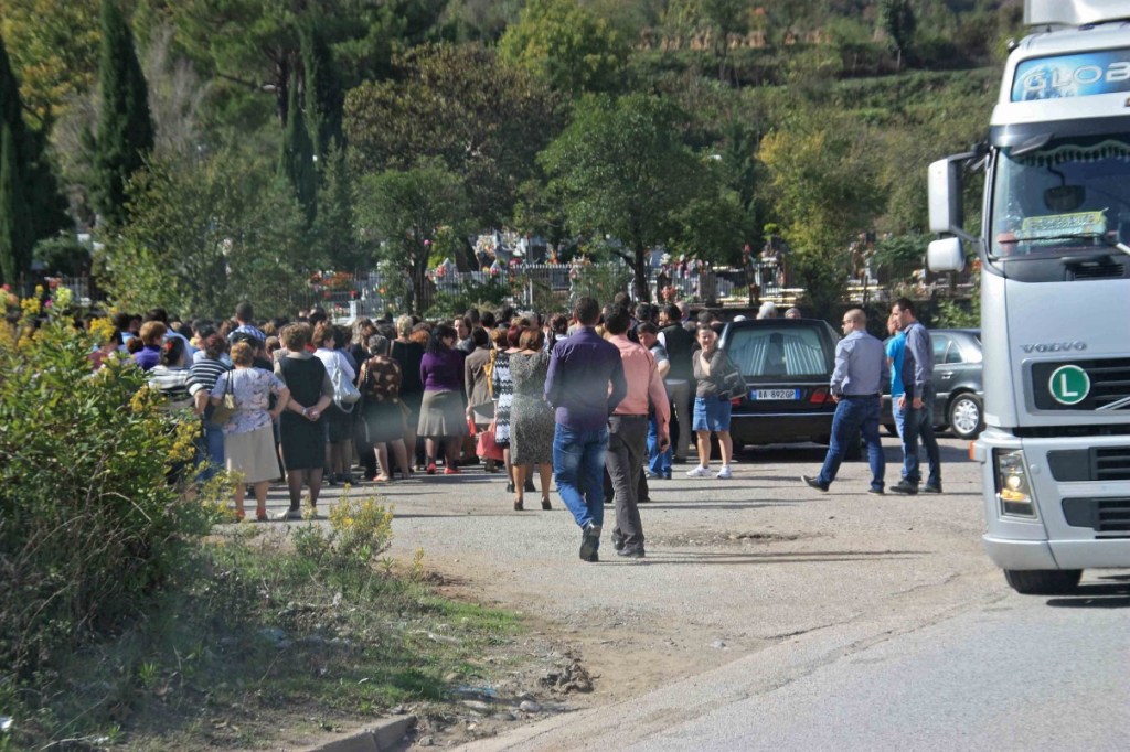 Tom heeft het niet zo op Albanië. De beschikbare kaartinformatie is blijkbaar zeer beperkt en levert soms gekke routes op. Zo komen we dwars door Librazdh en raken verzeild in een begrafenisstoet. Een paar honderd mensen lopen in de stoet en auto’s halen de meest rare capriolen uit om er voorbij te komen. Drie dik inhalen om vervolgens klem te komen zitten bij tegenliggers die hetzelfde doen.
