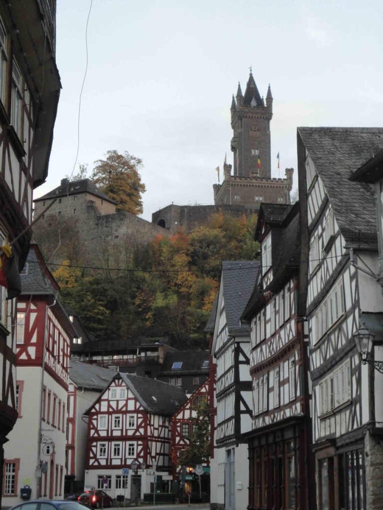 Tegen vijf uur rijden we van de ene file naar de andere. We besluiten te stoppen in Dillenburg. Dit blijkt een leuk oud stadje te zijn met connecties met de Oranjes (Willem van Oranje is hier geboren). Veel vakwerkhuizen en een oude burcht die boven de stad uittorent. We lopen even rond en belanden in een gezellig kroegje in een oud smal vakwerkhuisje. Als we vragen of ze ook wat te eten hebben wordt er pizza voor ons gehaald. Tweede avond pizza, maar het smaakt prima en het is gezellig.