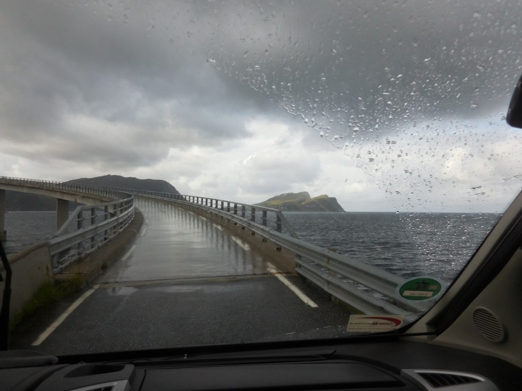 We overnachten op een grote parkeerplaats bij Andalsnes en de volgende ochtend rijden we in regenachtig en koud weer de Atlanticveien met zijn beroemde bruggen.