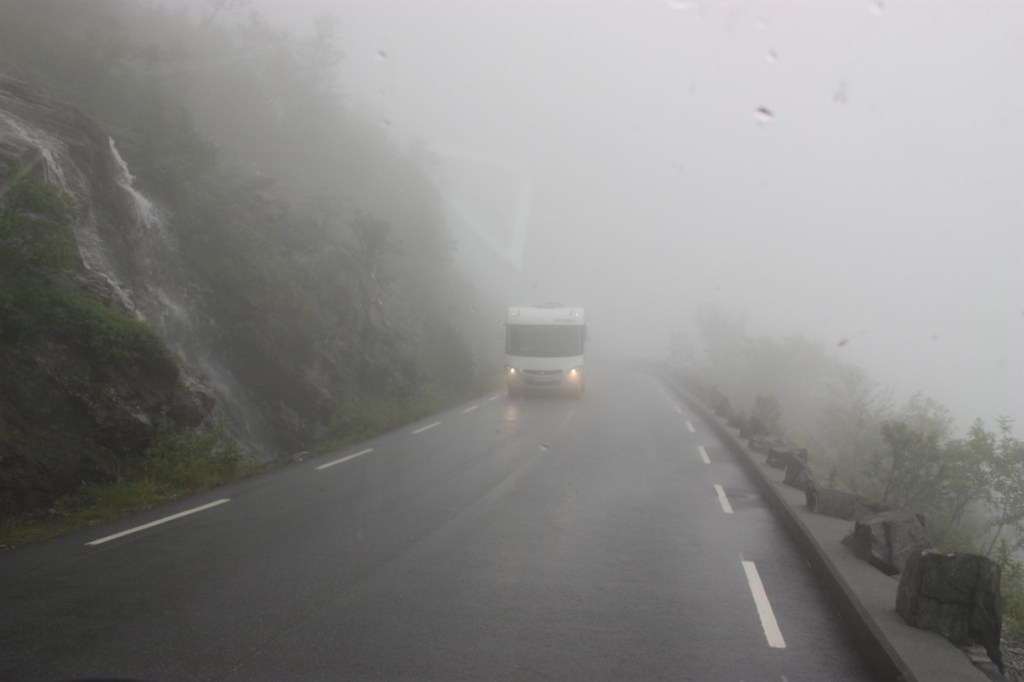 Maar we hebben mazzel. Bij het uitzichtpunt bovenaan de Trollstigen breekt net even het zonnetje door. We zien waar we naar beneden moeten, maar of ik daar blij van word? We zien in een haarspeldbocht een bus en auto klemzitten…. Terug bij de auto trekt het weer dicht en we rijden in dichte mist naar beneden. Gelukkig maar 1 lastige tegenligger, een vervelende Duitse camper die niet aan de kant wil gaan. Frans lost het mm voor mm knap op! Of het de omweg waard was? Seen it, done it!