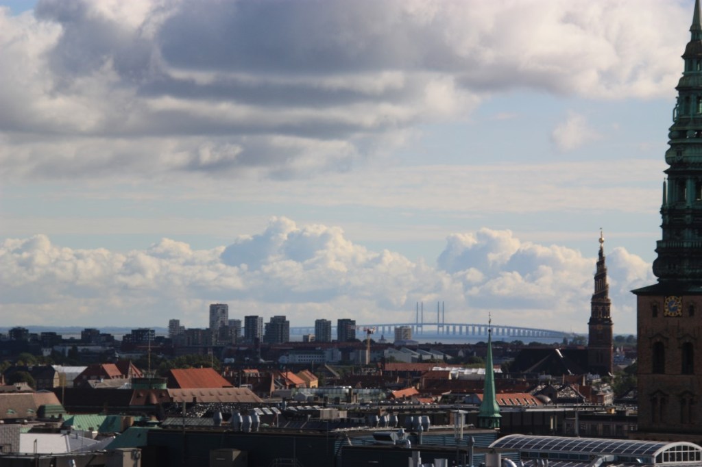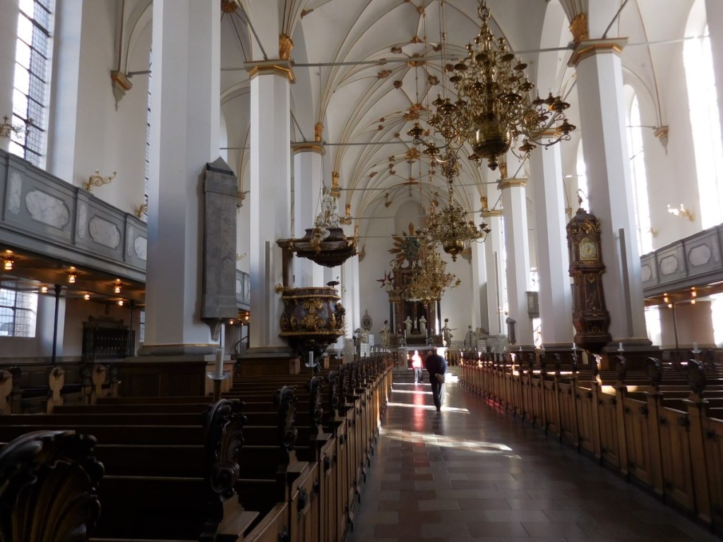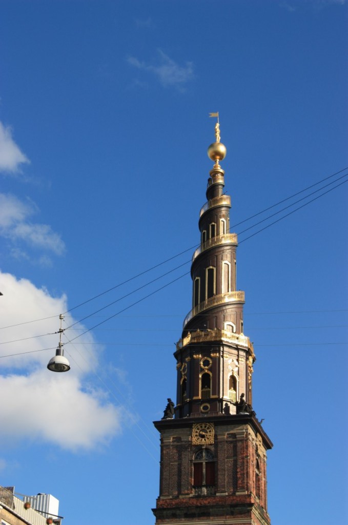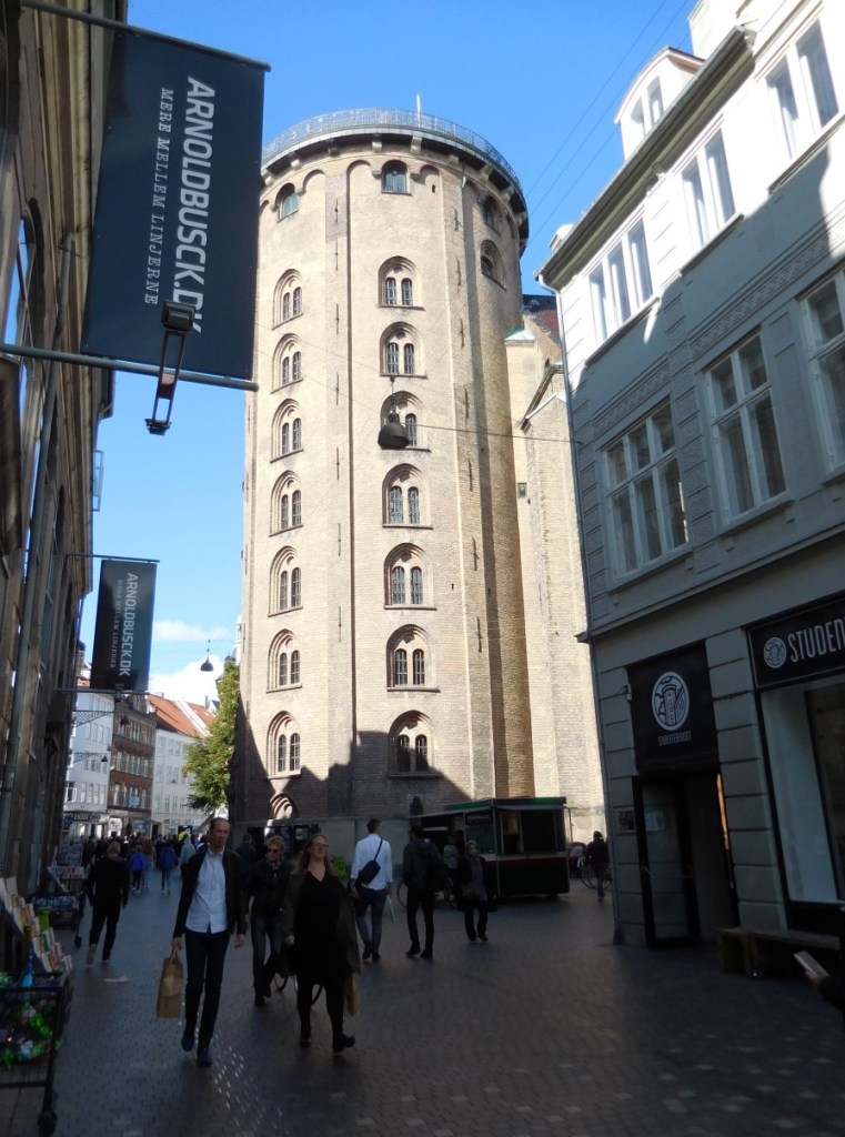Toch maar niet, het centrum lokt. Veel smalle straatjes met winkeltjes, restaurantjes, etc. en pleintjes met gezellige terrasjes. Door het mooie weer is het overal gezellig druk. Uiteraard lopen we weer tegen een kerk aan. De domkerk van Kopenhagen in Deens classicistische stijl. Groot, ruim, wit en strak. Vlak daarbij staat de ronde toren. In de toren loop je via een spiraal vormige gang omhoog met bovenin prachtig uitzicht over de stad.