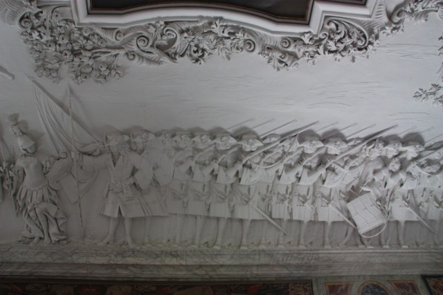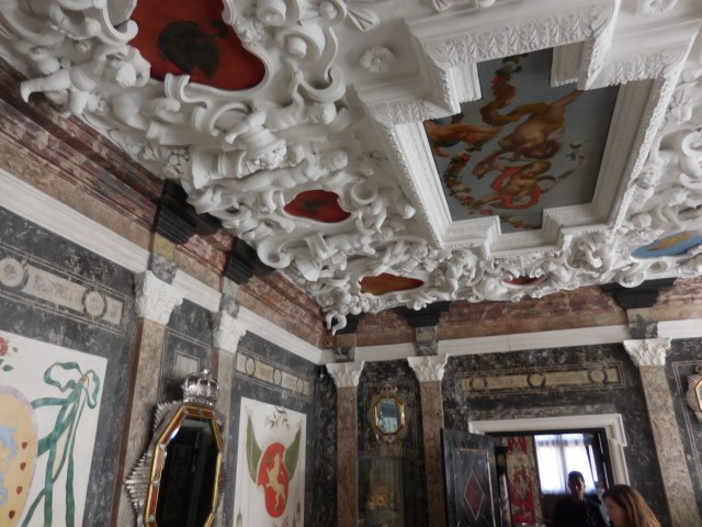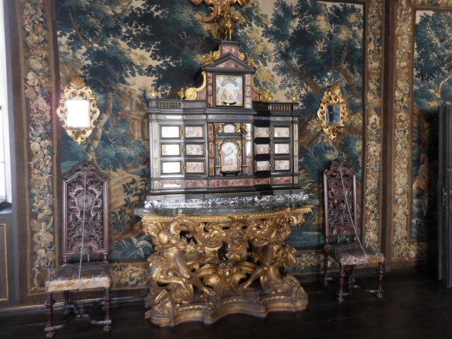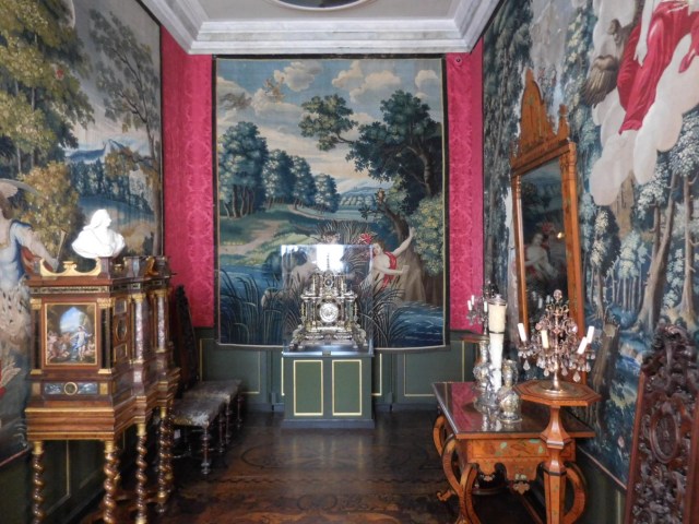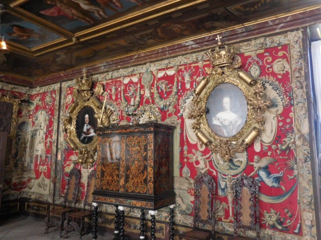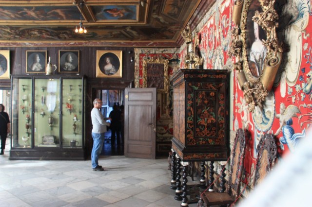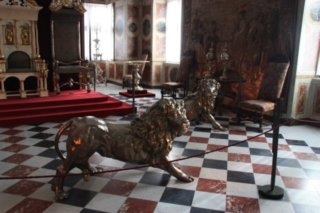 Dan toch het Rosenborg kasteel. Mooi gelegen in het centrum van Kopenhagen in een groot park is dit een van de Koninklijke paleizen in Kopenhagen. Het kasteel bevat een aantal stijlkamers uit de tijd van de oude Deense vorsten met bovenin een ridderzaal met een stel mooie zilveren leeuwen. In de kelder de schatkamer met de kroonjuwelen. Alle ruimten zijn overdadig versierd met beschilderde lambrisering, houtsnijwerk, schilderijen en beeldhouwwerk. Eigenlijk een beetje te veel van het goede.