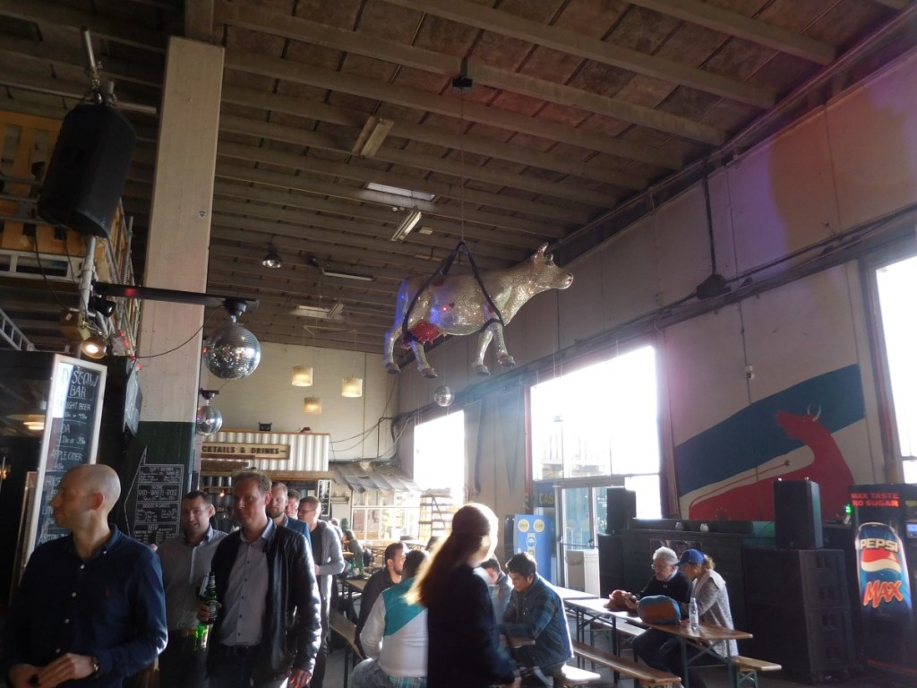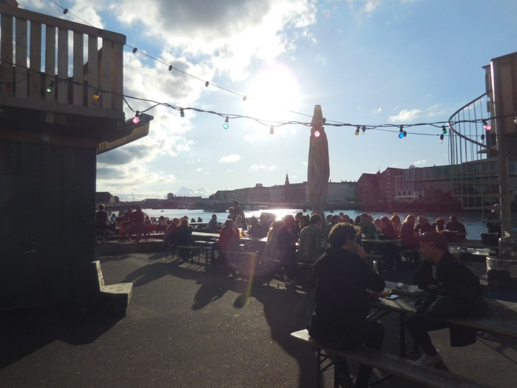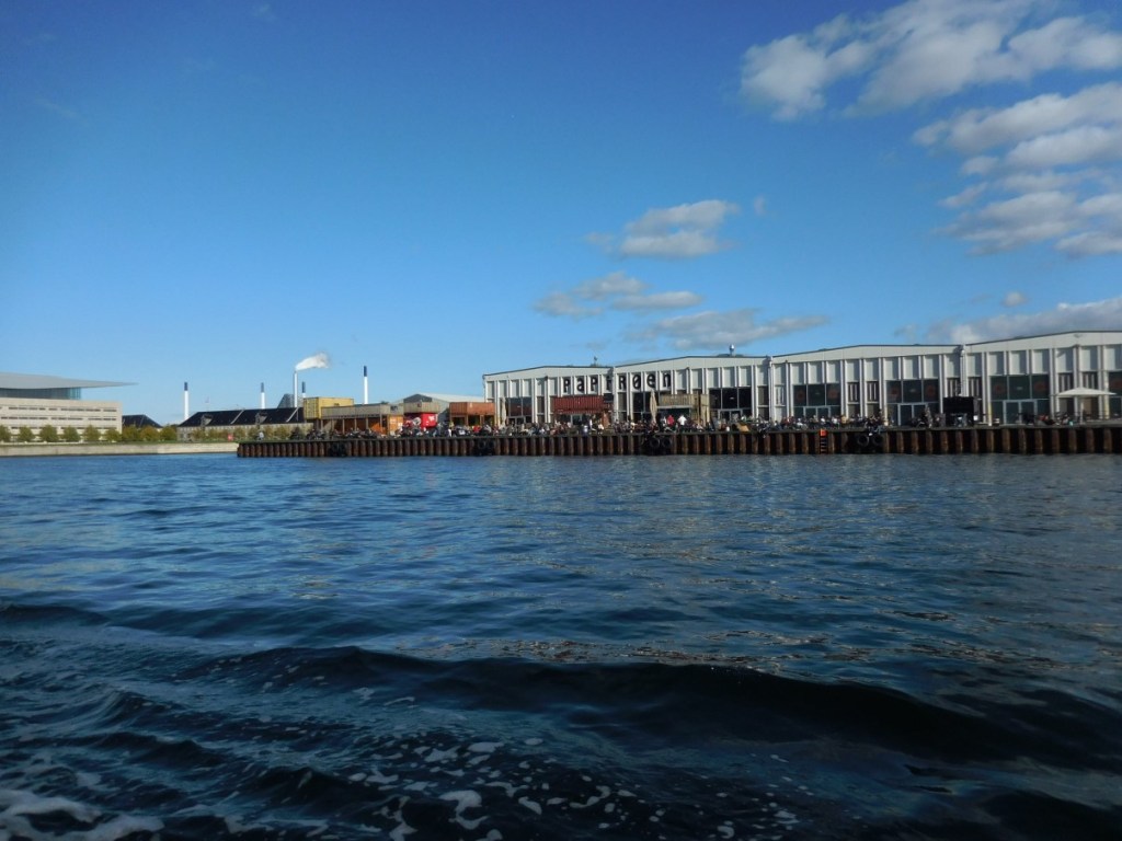 Ook zien we aan de andere kant van het water een groot terras bij Papiroen. Daar fietsen we na afloop van de rondvaart heen. Papiroen, of Paper island, is een enorme fabriekshal vol met allerlei kraampjes met streetfood, wijn en bier barretjes en een enorm terras aan het water. Door het mooie weer is het gezellig druk, er is life muziek en we genieten in het zonnetjes van een hapje en een drankje.