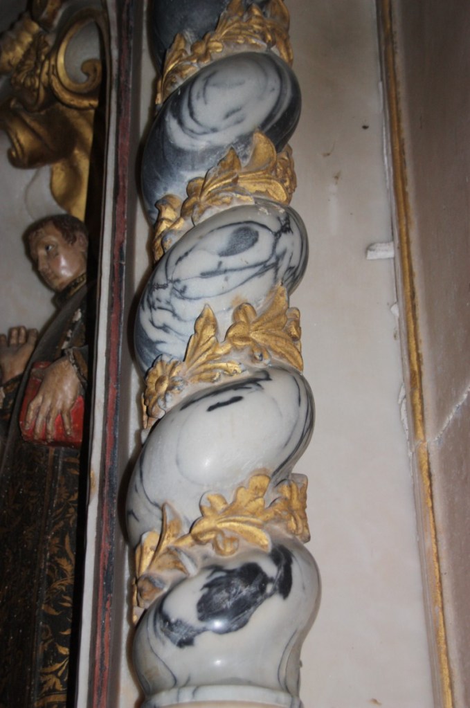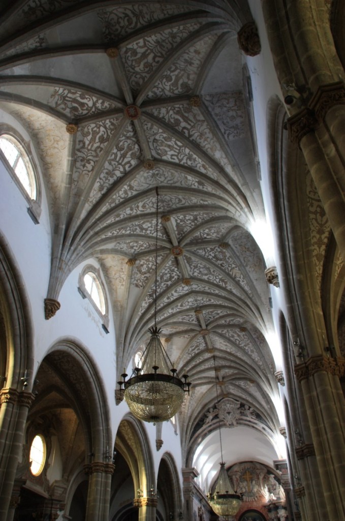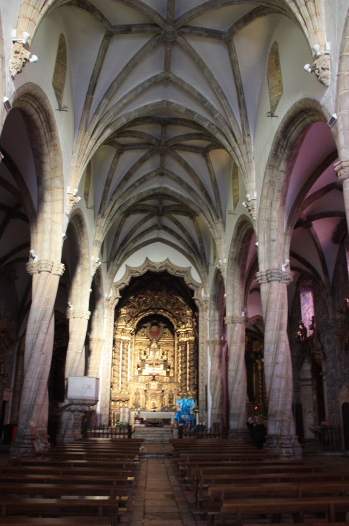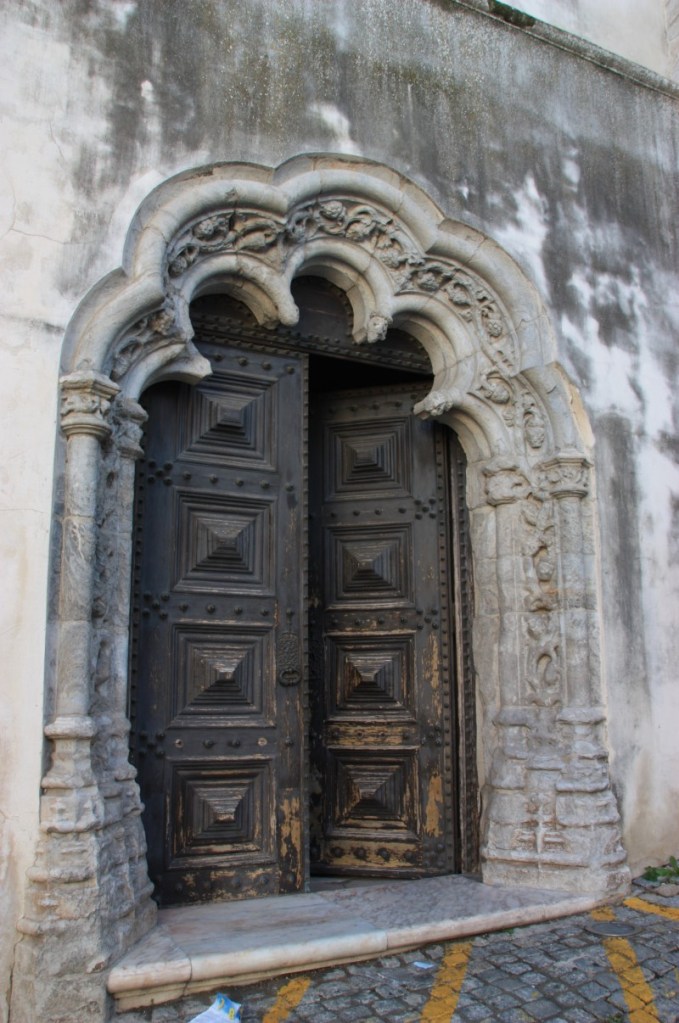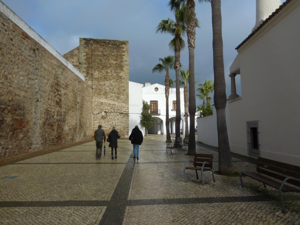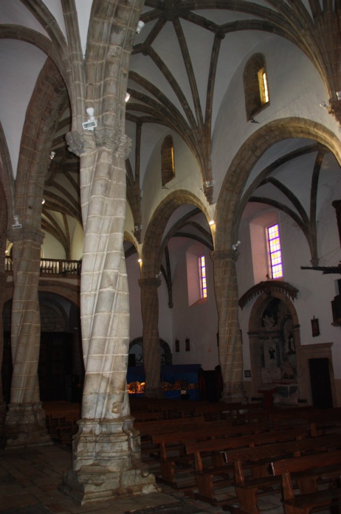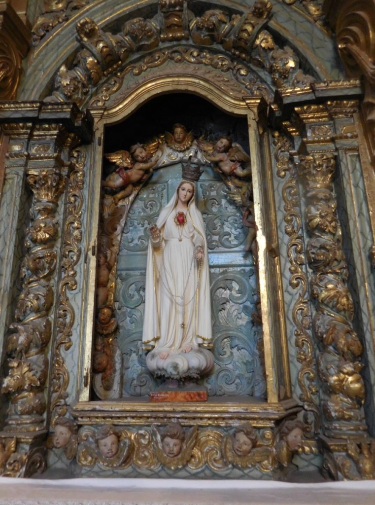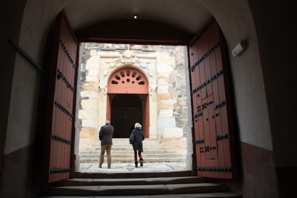 We maken een rondje over de stadsmuren, over sommige kun je gewoon rijden en sommige delen zijn parkeerplaats! Zo groot, breed en ruim…. Dan als toetje 2 van de 12 kerken in Elvas. De Nossa Senhora da Assunçao, de kathedraal van Elvas. De prachtige zuid poort is in Manuel stijl en binnen veel tegelwerk (azulejos) uit de 17e eeuw. Het oogt wat rommelig, veel stijlen door elkaar en dat klopt ook wel, er is erg veel verbouwd en gewijzigd in de loop der eeuwen.