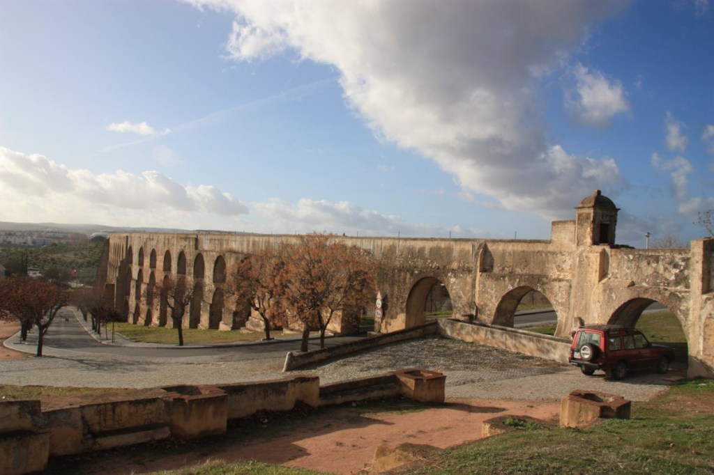 Dan op naar het aquaduct van Elvas. Het aqueduto da Amoreira bestaat uit 843 bogen verdeeld over 5 niveaus met een maximale hoogte van 30 meter! Tot voor kort was het nog in gebruik, maar als we dichter bij kijken zien we puin in de watergoot liggen (EEG subsidie in aantocht?).