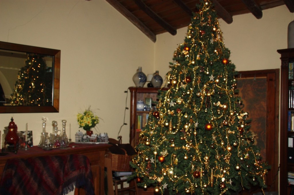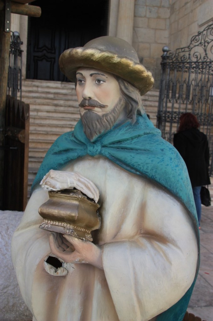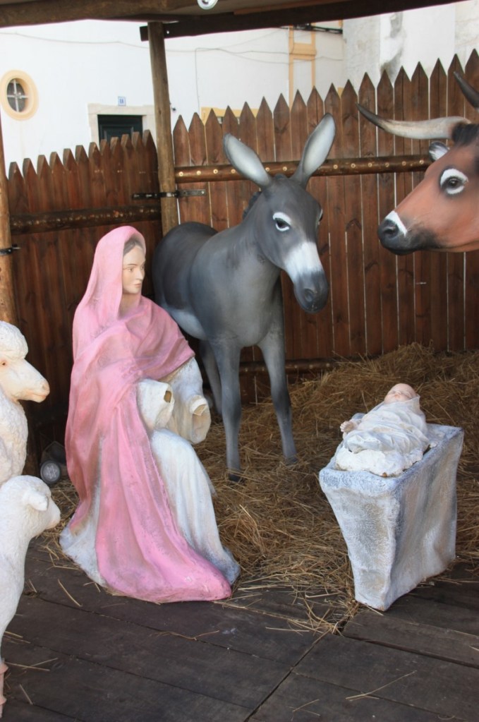 Terug naar kerstavond in Portugal. De kerstmis…. In Nederland komen we er nooit aan toe, maar hier…. de prachtige kerk van Olivenza, net over de grens in Spanje, lokt ons. Benieuwd hoe het er hier aan toe gaat. Als we binnen komen begint de kerk langzaam vol te lopen. Echt vol wordt het niet. Achter in de kerk staat een groepje jongens en meisjes verkleed als herders en herderinnetjes zenuwachtig te wachten. Als de mis begint komen zij naar voren met een kaarsje in de handen. Zij begeleiden het kindeke Jezus, een pop die voor in de kerk in de krib gelegd wordt. De dienst staat in het teken van verbinden. Met elkaar, met de wereld…. Voor zover wij het kunnen volgen…