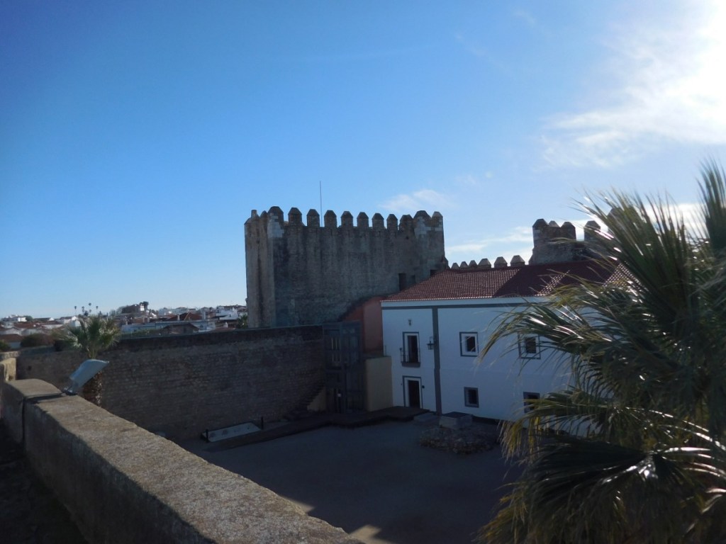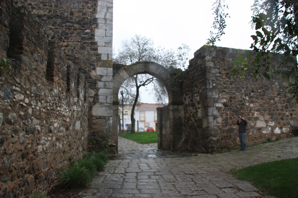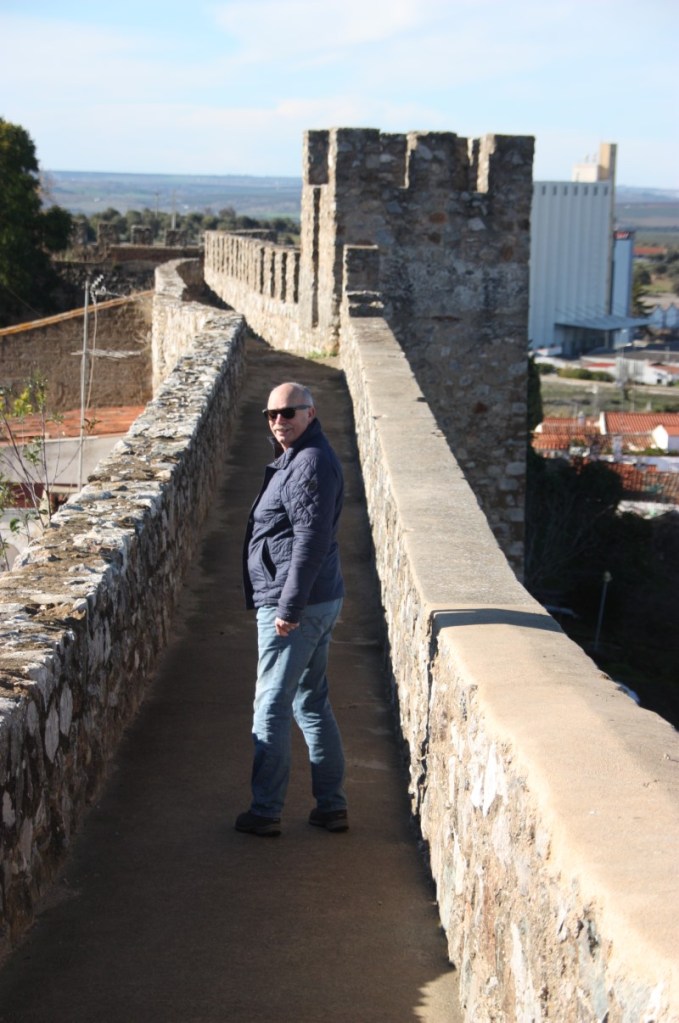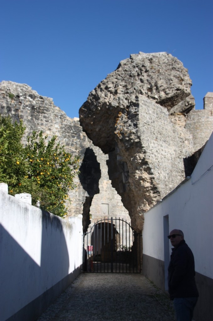 We zoeken de auto weer op en rijden naar de camping van Serpa, zo’n 30 kilometer verderop. Opwarmen en opdrogen ….. We eten in het nabijgelegen restaurant. Kaas, ham en olijven vooraf, spiesen voor Frans en lamskoteletten voor mij. Smaakt prima en het is gezellig druk. De volgende morgen een stralend blauwe lucht en een ijskoude wind. We lopen het historisch centrum van Serpa in via de monumentale Porte de Beja, met daarnaast de restanten van een Moors waterrad.