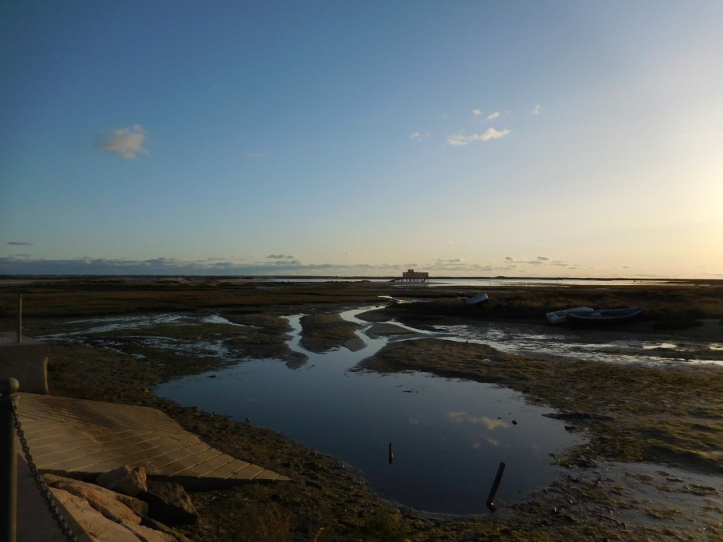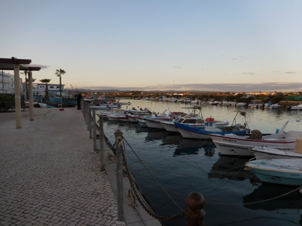 Als we Parque Campismo Fuseta oprijden komen we binnen in de wereld van de overwinteraars….. Rij na rij volgebouwde campingplekken. Campers, caravans met voortenten, kooktenten, andere tenten, karretjes, je kunt het zo gek niet bedenken wat mensen allemaal meeslepen….. We laten het eerst maar even over ons heenkomen…. Later maar kijken of dit beantwoord aan onze ergste visioenen over overwinteren…. Of dat het toch wel wat heeft….. Eerst maar naar de kust en genieten van de zonsondergang over de lagune.