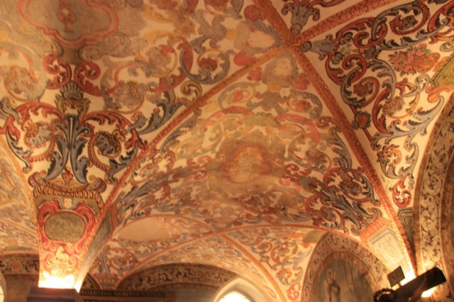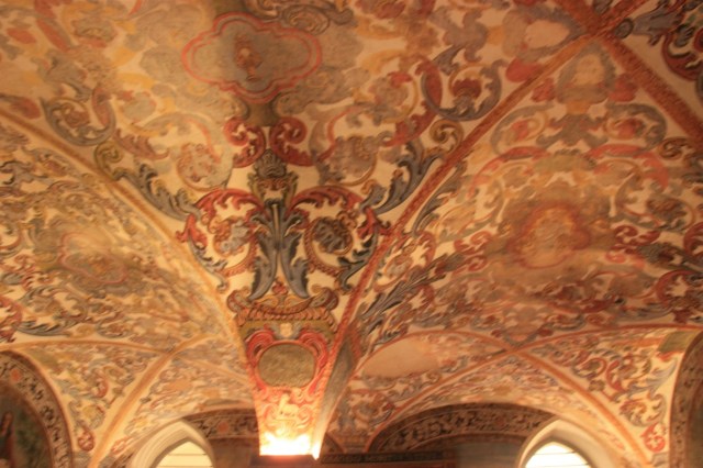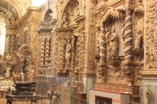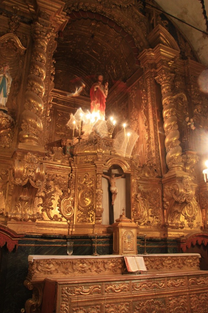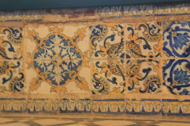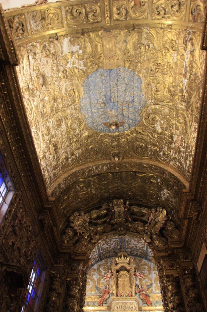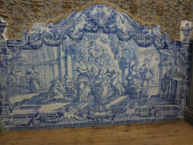 Nog steeds in de regen lopen we door de smalle straatjes naar het Regionaal Museum, gevestigd in een oud klooster. Opnieuw een prachtige rococo kerk (Manuel stijl ramen) en een werkelijk fantastische kapittelzaal. Prachtige azulejos (Moors) en beschilderd bovenplafond. Wij zijn de enige bezoekers met ongeveer 5 man personeel/bewaking…..
