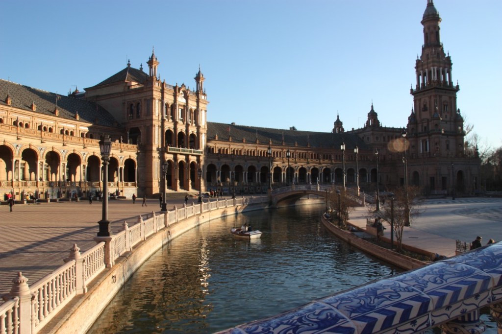 We lopen via het park Maria Luisa, met hierin een enorm paleis. Nu in gebruik door de universiteit en door een aantal musea. Grappig is de gracht die nergens heenloopt, maar waar je bootjes kunt huren om heen en weer te roeien…..