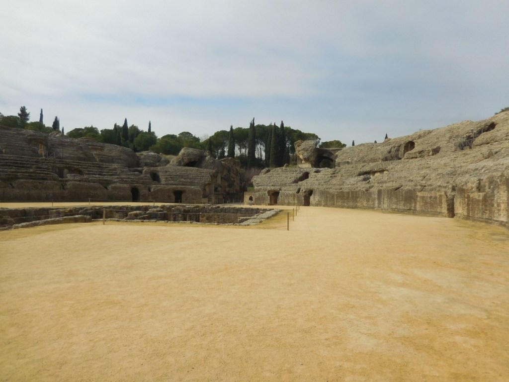 ’s Ochtends breken we op en rijden we dwars door de stad (gelukkig niet in de oude smalle straatjes beland!) naar de oude Romeinse stad Italica. Veel mozaïeken en een groot stadion. Veel meer verweerd dan wij in Griekenland en Turkije gezien hebben. De zitplaatsen zijn nauwelijks meer als zodanig te herkennen. We zien een mooie film hoe het leven er vroeger uitzag.