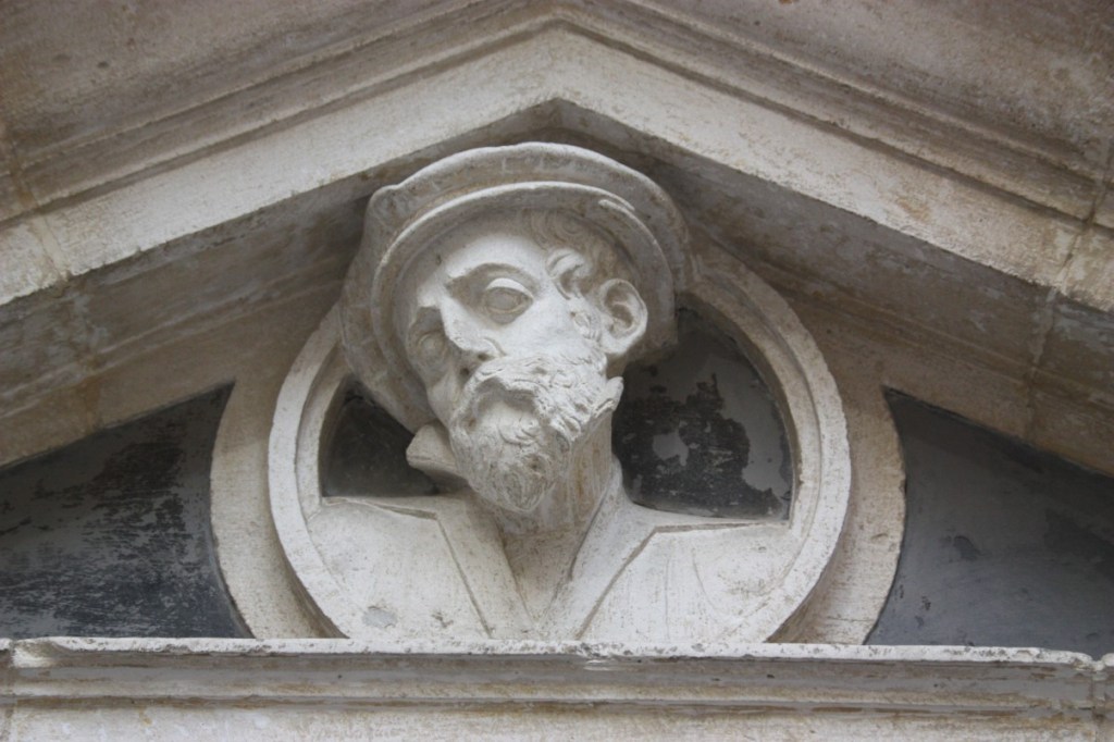 Binnen de graftombe van Columbus, de kist wordt door dragers gedragen. Bijzonder is ook de patio de los Naranjos, een enorm binnenplein met sinaasappelbomen.