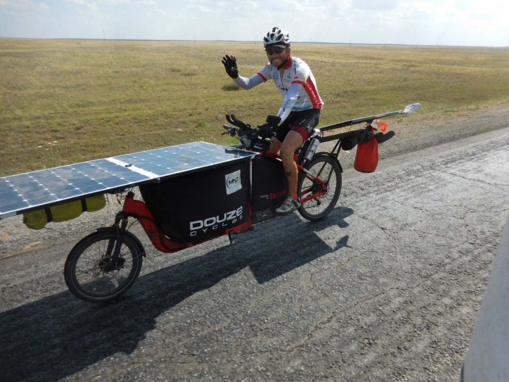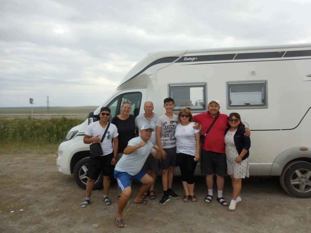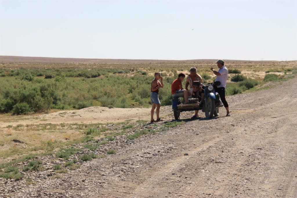 In Oral vullen we alles weer bij geld (100 Tenge is 25 cent), gas, diesel, water en Kazachstaans telefoonkaartje. We zijn de aapjes in de dierentuin, maar de Kazachstanen zijn vreselijk vriendelijk en doen hun best een paar woorden met ons te wisselen. Dan na de lange dag op naar de wildcamp op een veld achter Oral. Opnieuw een mooi plekje inclusief herder met schapen en paarden. Iets te laat komt de waarschuwing de man vooral geen alcohol te geven….. hij zit al achter een biertje…. Het is warm, zo’n 30 graden. De volgende dag opnieuw een lange dag achter het stuur. Het landschap verandert langzaam en wordt steeds kaler met witachtige heuvels in de horizon. In 480 km komen we 2 dorpjes tegen en 3 fietsers! Een tandem en een eenzame fietser onderweg in een internationale solar race per fiets naar China…..