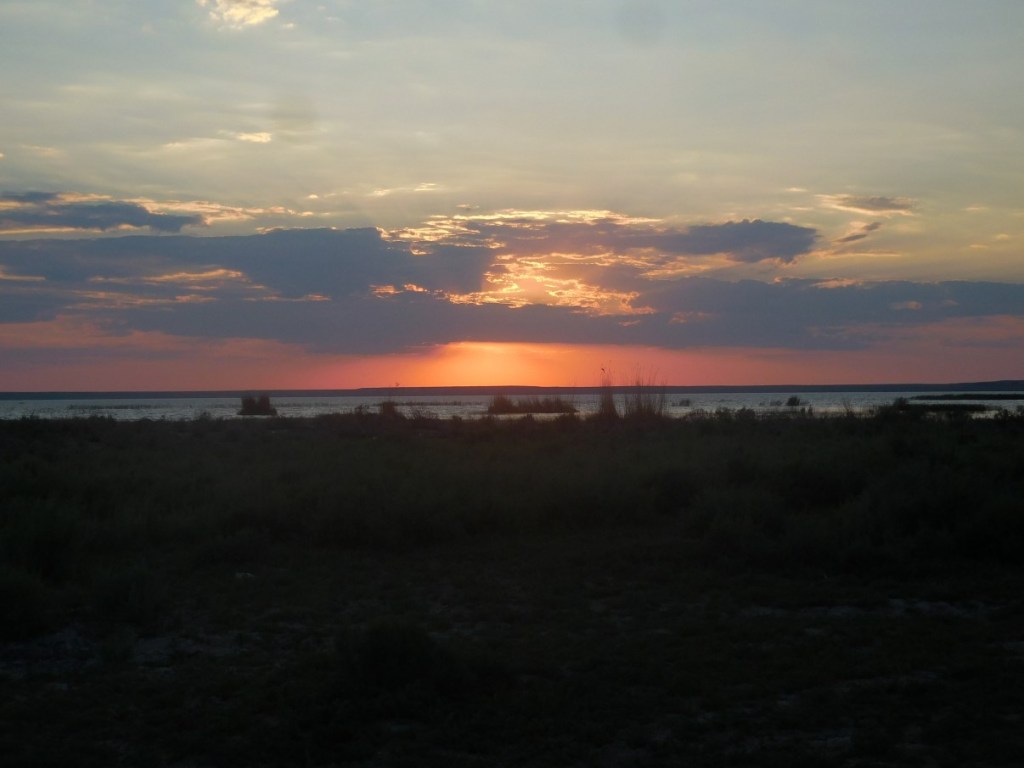 We zijn toch wel heel blij met de airco in de auto. Sam ligt er met zijn neus onder… De overnachtingsplek is een wildcamp op de steppen. Mooie plek maar snikheet.