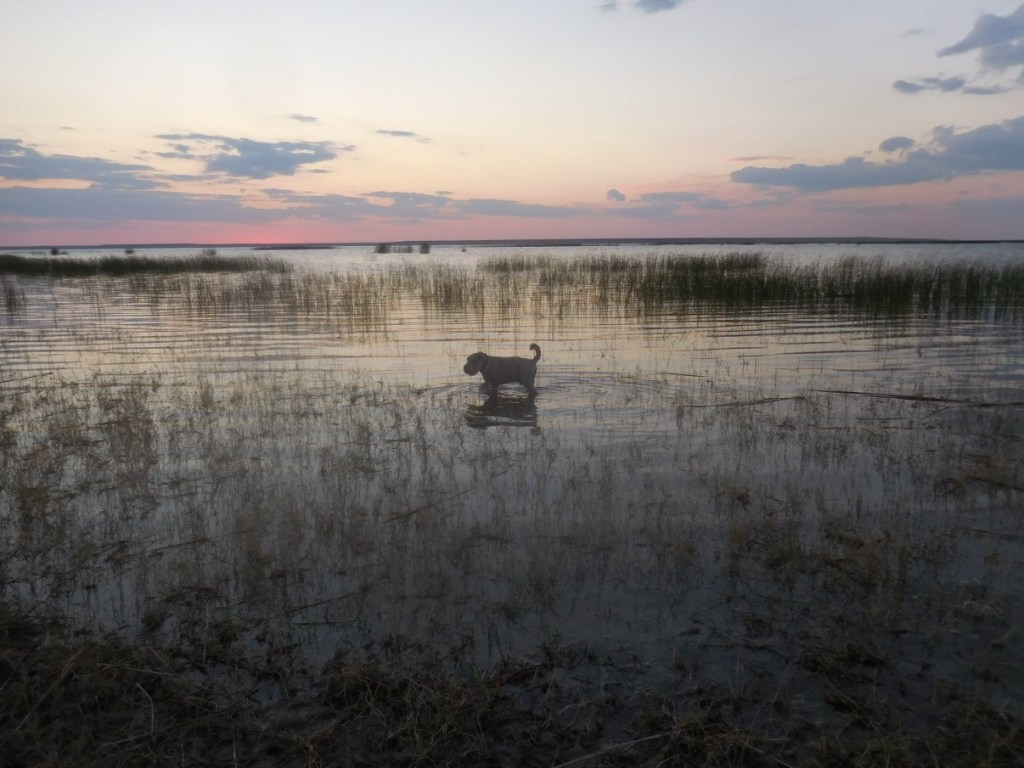 Prachtige wildcamp aan het meer met fantastische zonsondergang. Sam geniet van het meer, net als wij. Zalig fris windje over het water.