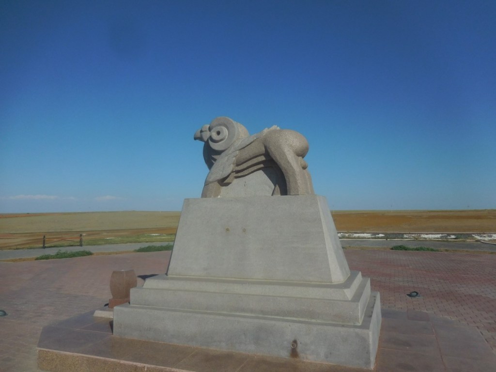 We overnachten op de parkeerplaats van het mausoleum van Korkut Ata. Geen superplek. Het asfalt houdt de hitte vast, dus het is tot ver in de avond ver boven de 30 graden. Korkut Ata was een beroemde Turkse dichter en zanger (8e of 9e eeuw) en maker van het muziekinstrument de kobyz. Vreemd, zo’n groot monument in het midden van niets… Toch stoppen er regelmatig auto’s met Kazachstanen die even rondkijken (ook bij ons…) en weer verdergaan.