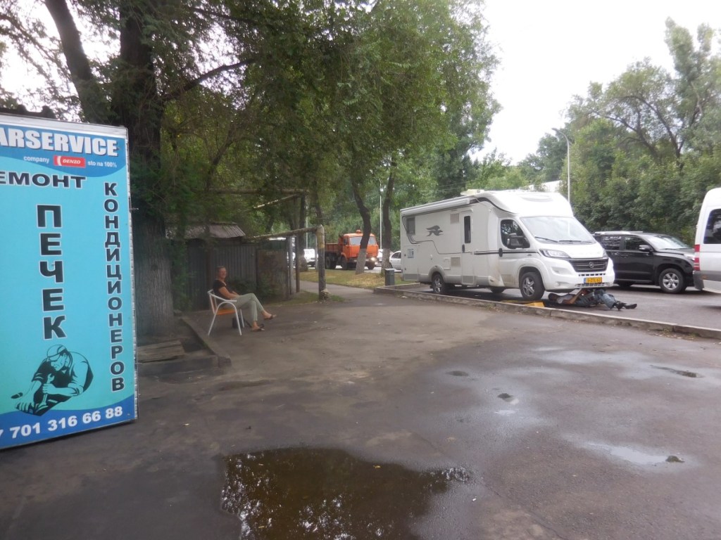 Het is druk onderweg. Hoe dichter we bij Almaty komen hoe erger. We tanken diesel en een stukje verderop gas. Het gasmannetje schrikt wakker, stuift naar buiten in pyjamabroek, ziet mij, schiet weer naar binnen en komt even later weer keurig gekleed naar buiten….. Dan komen we in de puinhoop voor Almaty. 4-baans weg onder constructie. Iedereen zoekt zijn eigen weg kris kras door elkaar heen met vaak 6 rijen dik waar eigenlijk maar plaats is voor 3…. We overleven het.