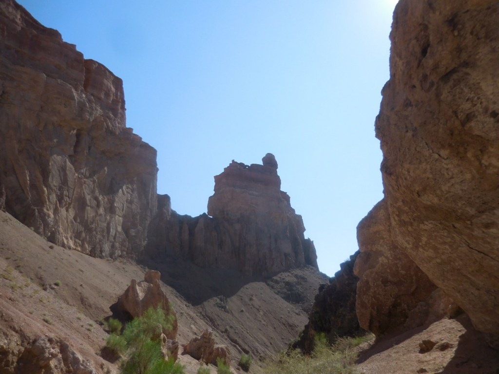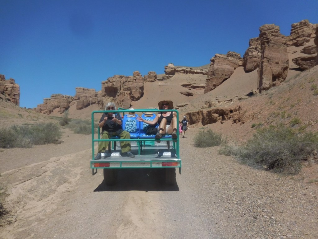 De laatste 20 km naar Charyn Canyon is heel slecht. Wasbord en maximaal 20 km per uur. Frans rijdt 30 dus Sam en ik rammelen er zo’n beetje uit…. Maar het uitzicht eenmaal aangekomen op Charym Canyon vergoedt veel.