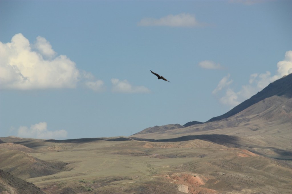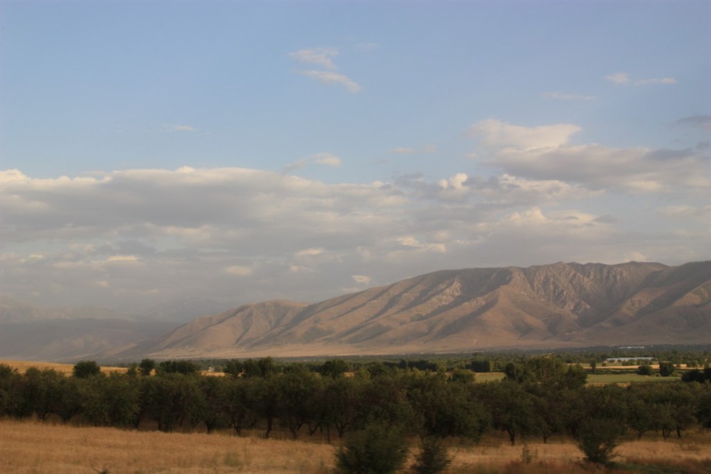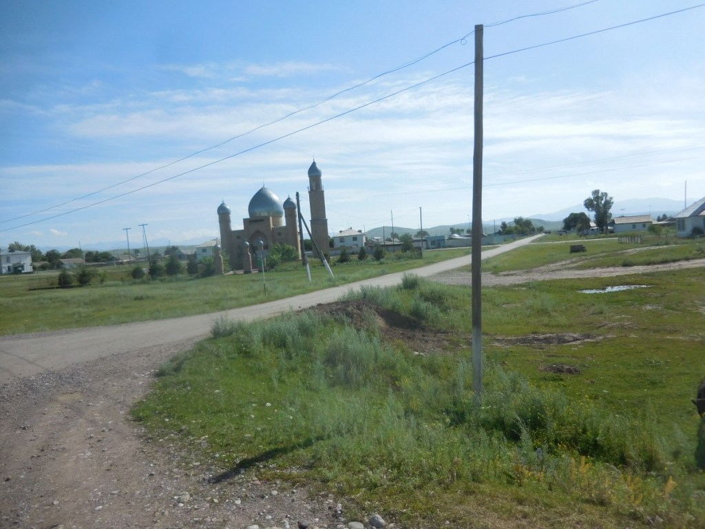 Een koelkastmagneet rijker rijden we weer verder richting Almaty (Alma-Ata). De rit is minder mooi als gehoopt. We rijden langs grens met en de bergen van Kirgistan, maar zien er weinig van. Zacht glooiende heuvels met landbouw en veeteelt met in de verte grenswachttorens.