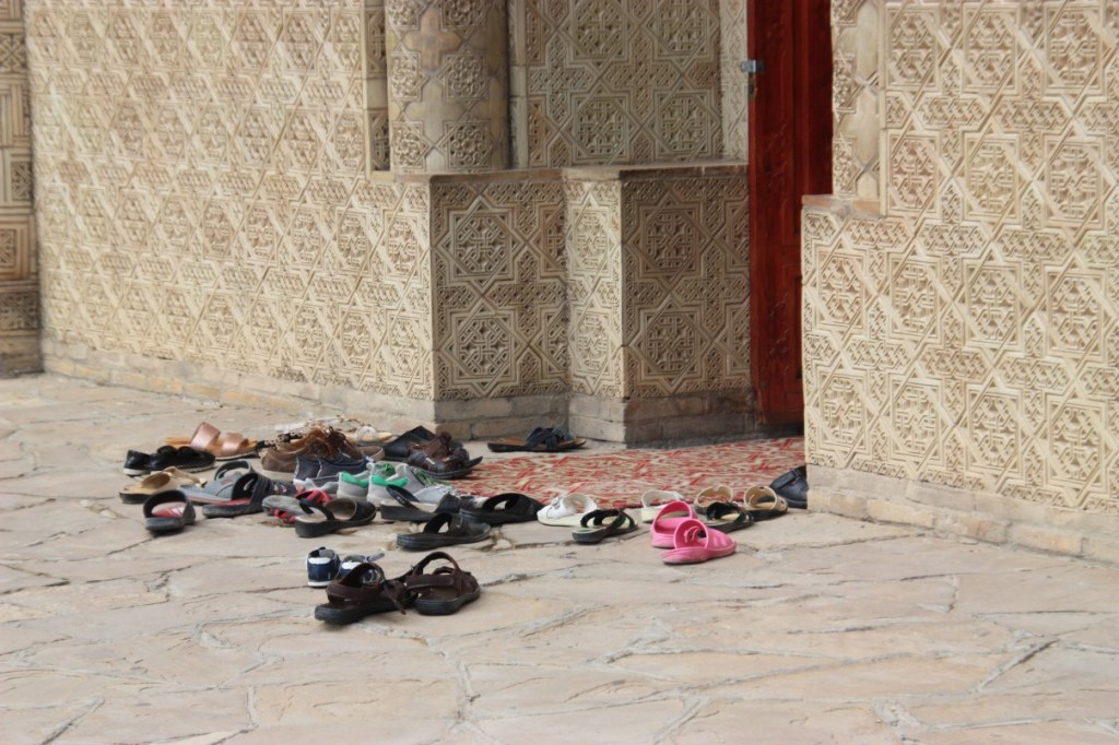 Bij Otrar gekomen worden we door twee enthousiaste dames uitgenodigd de plaatselijke moskee te bezoeken. Er schieten al snel ook een paar mannen te voorschijn, die iets meer bedenkingen lijken te hebben, maar we mogen rondkijken en fotograferen. Dit is echt een moskee in een dorp die dagelijks gebruikt wordt zonder pracht en praal.