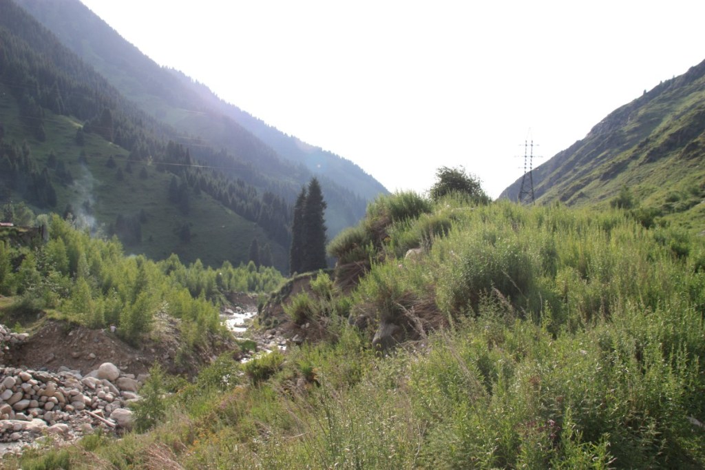 We krijgen een appje dat het erg druk is op de beoogde overnachtingsplaats bij de schaatsbaan Medeo. We hebben ‘vrij’ in het reisschema, dus we besluiten maar direct door te rijden naar het Nationaal Park Ile Alatau tegen Almaty aan. Ook daar is het superdruk met mensen die aan het picknicken en BBQ-en zijn. Bij het riviertje in een bocht naar het grote meer van Almaty vinden we een plekje. Mooi plekje met prachtige bloemen.