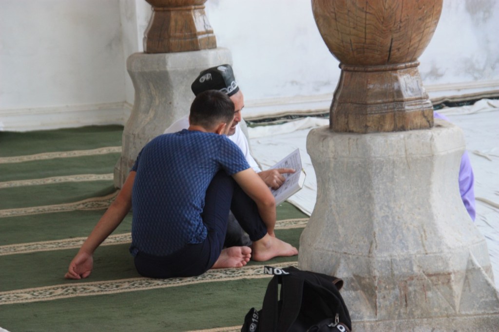 Het hotel staat leeg, dus we hebben geen voorzieningen. Voordeel is dat het midden in het oude centrum van Samarkand staat, met de bezienswaardigheden op loopafstand. Aan het einde van de middag lopen we het centrum in. We passeren een prachtige oude moskee. Hier wordt echt nog les gegeven in de Koran, zoals we horen van een leerling die net 4 uur lang de lessen gevolgd heeft…. Hij wil graag zijn Engels oefenen, dus we horen een hoop over het huidige leven in Samarkand en de rol van de Islam. Lijkt veel minder streng dan in andere landen.