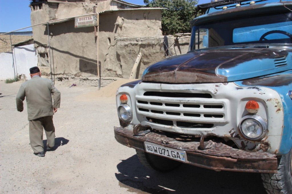 Zondag 12 augustus breken we weer vroeg op voor de rit naar Buchara. We wilden eigenlijk via een mooie pas, tot iemand net op tijd zag ‘cars only’. Waarschijnlijk dus een tunnel met beperkte hoogte! Omdat niemand zin heeft in een cabrio camper besluiten we de ‘saaie’ weg naar Buchara te nemen. Onderweg weer diesel tanken uit eigen vaten…. We worden er steeds handiger in, toch begint de auto behoorlijk naar diesel te stinken. Probleem is ook dat we nergens de lege vaten en smerige plastic zakken kwijt kunnen. Nergens een container of vuilnisbak te zien….