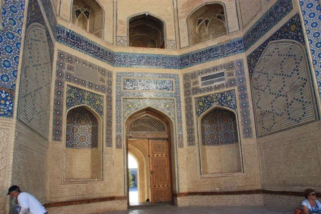 We lopen terug naar het hotel. Sam is al weer lang genoeg alleen in de warmte geweest. Siësta voor Sam en ons. Tegen vijf uur lopen we opnieuw de stad in. Eerst over het plein Labi Hauz. Rondom het waterbekken, met een beeld van plaatselijke ‘Don Quichot’ lopen we naar de Medresse Nadir Devon Begi met prachtig tegelwerk. Bovenin twee pauwen met onder de vleugels een wit lam. Eigenlijk is het een karavanserai, maar omdat de Chan het gebouw een medresse noemde werd het een medresse (Arabisch voor school). Net als vele mooie gebouwen is het volgehangen met souvenirs.