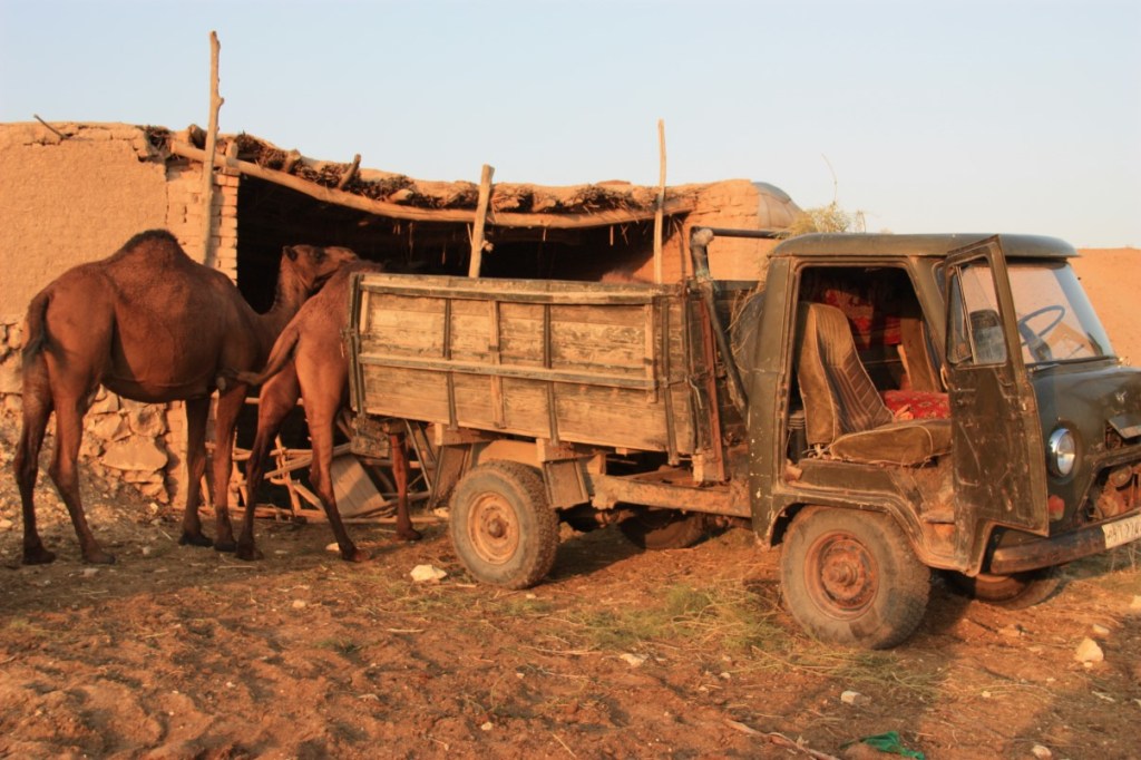 We tanken opnieuw diesel uit eigen voorraad. Het is 42 graden buiten! 80 km voor onze bestemming houdt de snelweg weer op en hobbelen we over het laatste stuk langs irrigatiekanalen en landbouw. Het is tegen 7 uur ‘s avond en de mensen komen terug van het werk. Lopend, op ezelwagentjes en per fiets. We overnachten vannacht bij een yurtenkamp naast Ayaz Quala. Een oud fort op een heuvel (eigenlijk 2 forten). Als we aankomen loopt net een kudde kamelen tussen de campers. We worden gezandstraald door de harde wind en het is ‘s avonds nog 33 graden, maar het is een prachtig plekje.