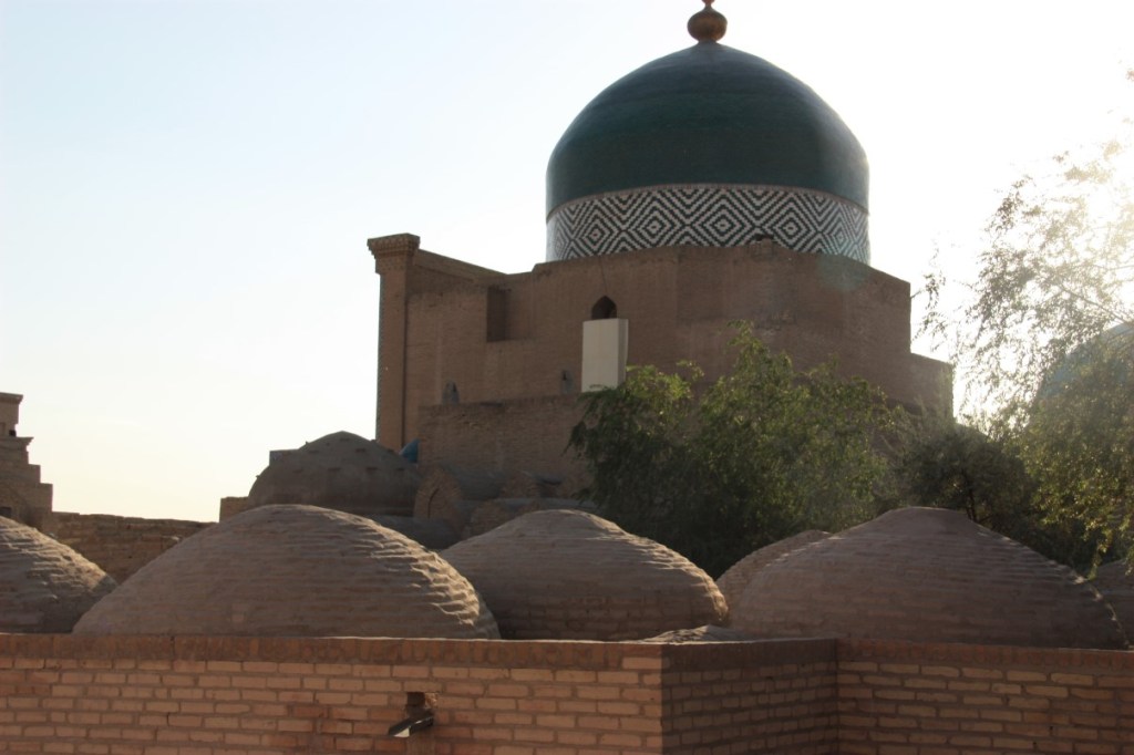 Na een lekkere koele nacht (25 graden) maken we ons op voor ons bezoek aan de laatste ‘oude’ stad in Oezbekistan, Khiva. Rond 1 uur ‘s middags rijden we de parkeerplaats op bij hotel Asia. Geen spatje schaduw en 34 graden. We staan net buiten de muren van de oude stad.