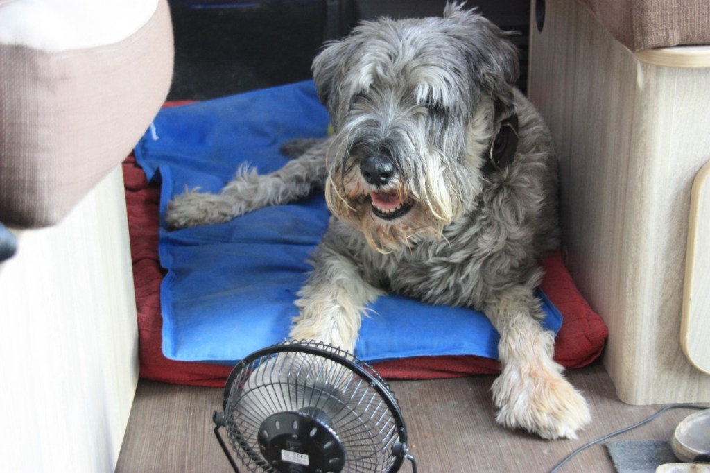 Terug op de 44 is het saaiheid troef, bovendien wordt het steeds warmer…. 42 graden! We stoppen op een parkeerplaats bij Garmsar. Alles lijkt gesloten, maar een reisgenoot gaat op onderzoek uit en vindt een restaurant. We drinken thee en spreken af dat we ‘s avonds komen eten. We mogen er ook douchen! Turks eten. Forel met rijst, salade en soep. Prima! Sam ligt voor de ventilator op zijn koeldekentje. Hij heeft eigenlijk de beste (koelste) plek in de camper!