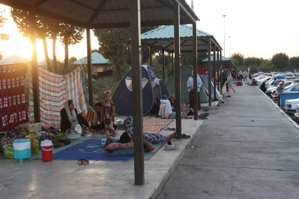 Daarna wordt het een puinhoop…. Door het drukke Varamin en dan de voorsteden van Teheran…. Leuk is dat regelmatig wanneer ik rij en passerende auto’s een vrouw achter het stuur van zo’n grote auto zien, de achterbank (daar zitten de vrouwen) zich omdraait en mij lachend een duim omhoog geven. Gelukkig bereiken we de parkeerplaats bij de graftombe van Khomeini heelhuids. Tot onze schrik/verbazing blijkt het net zo iets te zijn als het park in Mashhad. Een enorm parkeerterrein wat in de loop van de dag/avond helemaal volloopt met auto’s en tentjes. Dat werkt zo. Er komt een auto aanrijden met minstens 6 man erin en vol bagage. Er wordt een kleedje neergelegd en een tent uitgegooid. Vervolgens wordt het kookgerei opgestookt en gaat men op het kleedje liggen en zitten. ‘s nachts slapen de mannen buiten op het kleed en de vrouwen binnen in de tent. Uiteraard zijn wij weer de topattractie en het circus van Hellohowareyouwhereyoufrom en het vriendelijke Welcome to Iran gaat weer los….