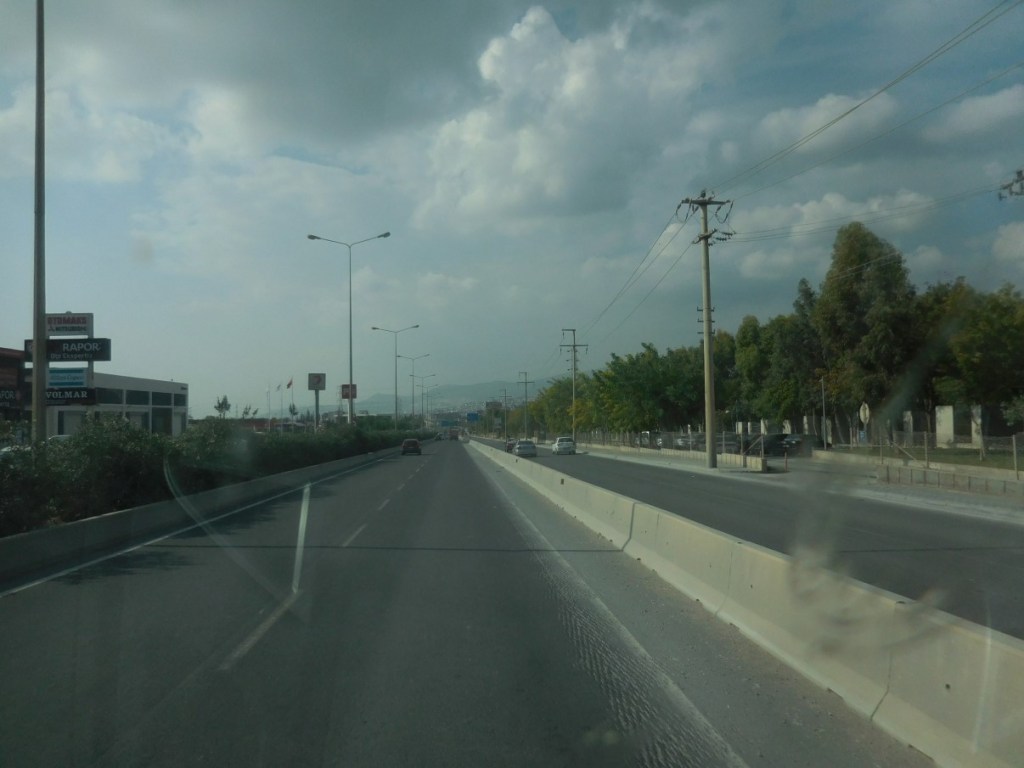Nog een stuk over prachtige wegen door de bergen en dan dichterbij de westkust allemaal vierbaanswegen. Onvoorstelbaar dat hier van die grote vierbaanswegen liggen. Wij rijden vrijwel alleen op de weg. Prachtige infrastructuur (hadden ze in de Stannen waar we eerder reden goed kunnen gebruiken), maar wel overdone. Pas bij Izmir wordt het drukker. Daar liggen nog grotere (tol)wegen en hoewel we beide Garmins op ‘Tolweg vermijden’ hebben staan, gaat het hier toch fout…. We komen toch op een tolweg terecht. De kaarten in de Garmins zijn blijkbaar oud en achterhaald. We hebben geen tolvignet, dus zo snel mogelijk er weer af. Lijkt erop dat we mazzel hebben. De tolweg is nog niet klaar, dus er hoeft (denken we) niet betaald te worden.