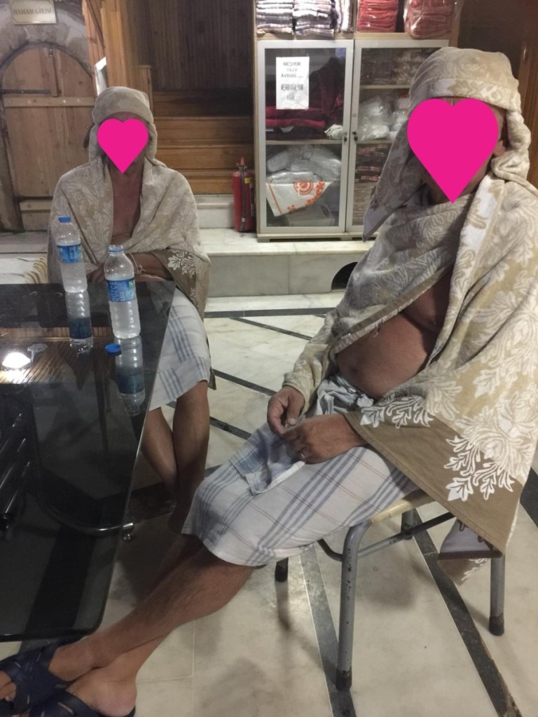 Ook in de relaxstand onze reisvrienden. Ondanks verwoede pogingen lukt het hen niet om Frans mee de Haman in te krijgen…. Zelf gaan ze gelukkig wel en genieten van een echte traditionele Turkse Haman! Om Frans jaloers te maken sturen ze even een appje tijdens de behandeling….. Ondanks dat we nooit foto’s van reisgenoten in de blog publiceren, kunnen we dit toch niet laten….. zij het wel onherkenbaar