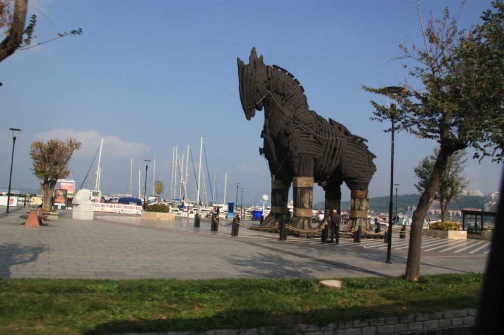 Woensdag 24 oktober tijd om afscheid te nemen van Turkije. We rijden naar Canakkale en nemen de boot naar Eceabat. Bij Canakkale zien we nog een fraai paard van Troje. De overtocht verloopt rustig. Het is wat heiig en de overkant is nauwelijks te zien. Kopje thee en koffie aan boord wordt gebracht. Thee in een glas, koffie in een papieren bekertje. Onderscheid moet er zijn!