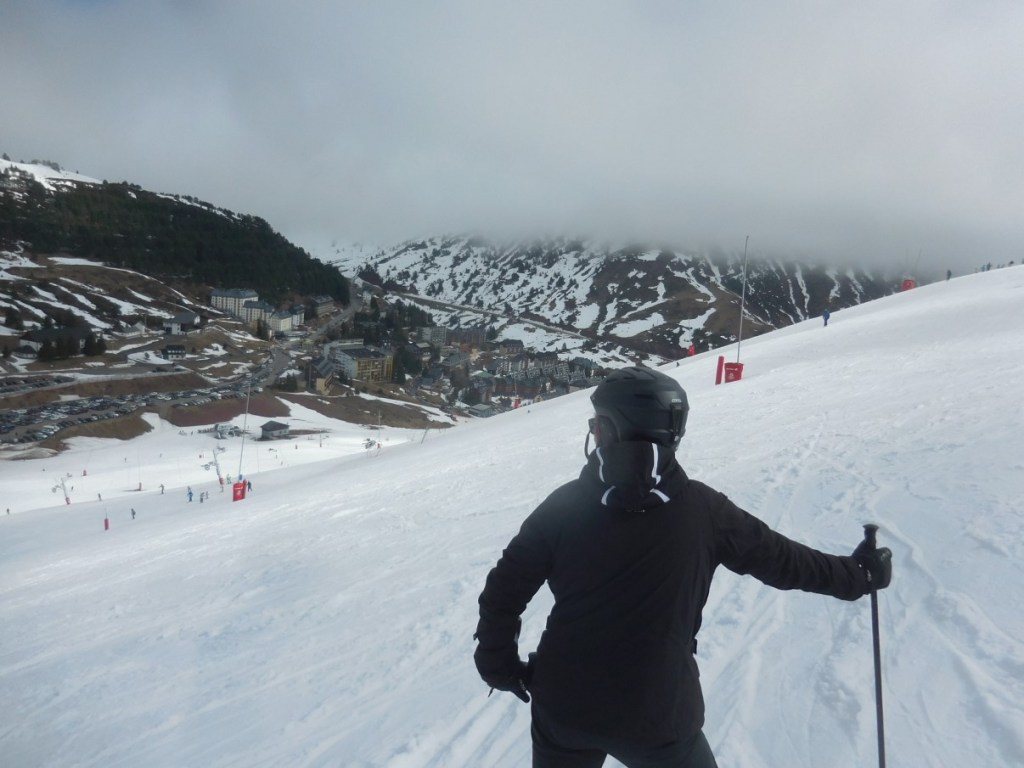 Rond drie uur houden we het voor gezien en genieten van het uitzicht op de piste. Het is zondag, einde weekend. Na vier uur loopt de parkeerplaats leeg. We zien ons zelf op de webcam eenzaam en alleen op de parkeerplaats staan…. ‘s Nachts regent het pijpenstelen en dat gaat in de ochtend over in sneeuw. Tegen 10 uur komt het zonnetje weer te voorschijn, maar voor de pistes is de afgelopen nacht desastreus. Regen is ijs geworden en daarover ligt een flinterdun laagje verse sneeuw. Gevolg…. gigantische glijbanen.