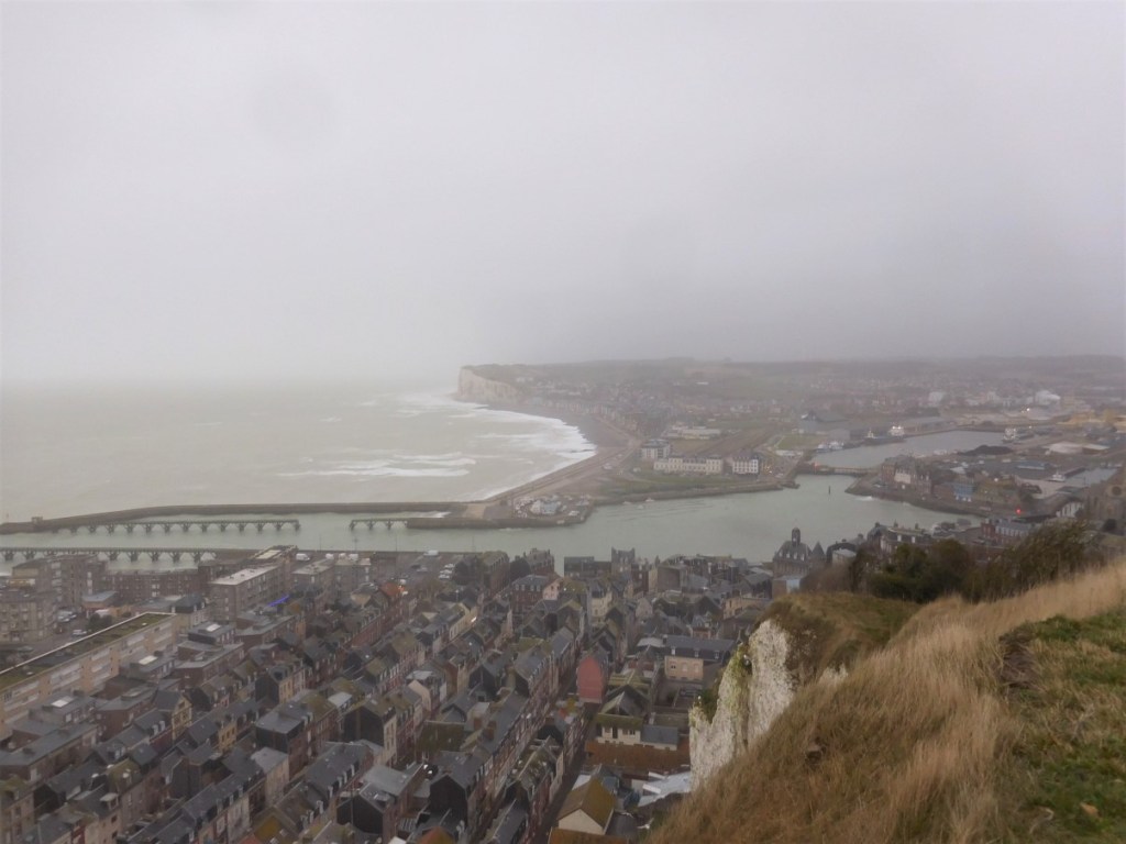 We lopen Le Treport in. Het miezert, het stormt en het is koud! Op de visafslag grote variëteit aan vis, schaal en schelpdieren. We weten al wat we straks gaan eten! Moules et frites! Eerst nog even met de lift naar boven. We komen uit bij de camperplek op de klif waar we eerder al weggewaaid waren. Prachtig uitzicht over Le Treport en de haven. Snel weer naar beneden. Ditmaal via de trappen.