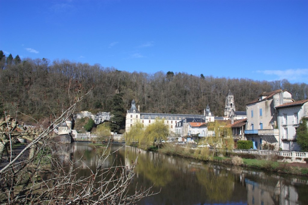 De volgende dag een prachtige dag in Frankrijk. We hebben Tom, of eigenlijk Gerrit (Garmin), op tolwegen vermijden staan. Dus we cruisen rustig door landelijk gebied in Frankrijk. Het is prachtig weer, de brem, prunus en allerlei andere bomen en struiken bloeien. Het is voorjaar in Frankrijk. We stoppen in Brantôme in de Dordogne. Ook hier waren we al eens eerder in de zomer. Groot verschil met nu, zo buiten seizoen is alles uitgestorven. Toch is het leuk om even door het stadje te wandelen en bij de abdij van Saint-Pierre de Brantôme rond te kijken.