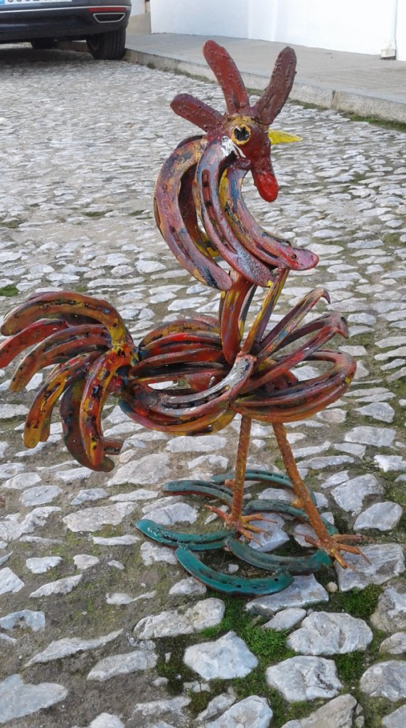 Buiten de grotten veel winkeltjes met allerlei toeristische prullaria, maar ook met een prachtige haan gemaakt van oude hoefijzers. Schitterend gemaakt!