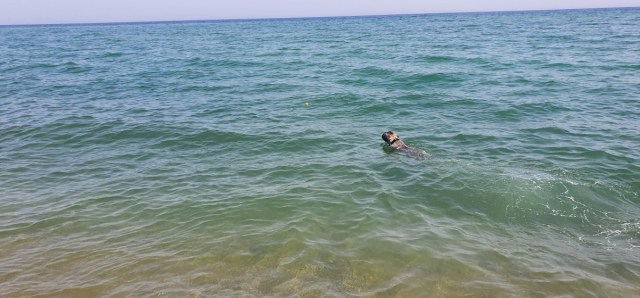 Ondertussen rijgen de dagen zich aaneen. Blog bijgewerkt, beetje zwemmen, wandelen met Hannes, eten bij het restaurantje, beetje lezen…. Het is nu zelfs zo heet dat wanneer we op het strand onder onze gekregen parasol op ons handdoekje zitten onze billen branden aan het hete zand…. Hannes heeft zich ondertussen ontwikkeld tot een volleerd zeehond. Hij zwemt keurig horizontaal met zijn staart als roer. Hij vindt het prachtig om achter de balletjes aan te gaan….