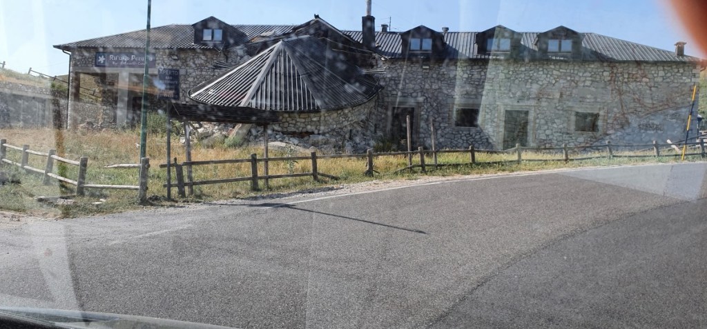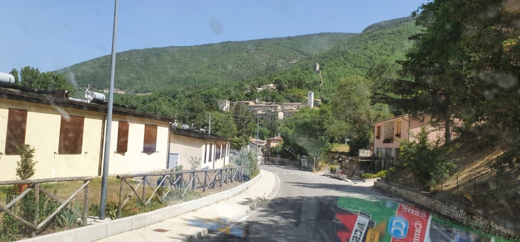 Zonder dat we er erg in hebben komen we in het aardbevingsgebied rond Amatrice. We zien heel veel tijdelijke woningen. Eerst maken we nog een grapje, dat de asielzoekers hier wel heel goed opgevangen worden… maar dan dringt de ernst tot ons door. Overal kranen en herstelwerkzaamheden en helaas ook nog veel ingestorte gebouwen. En dus heel veel noodwoningen en ook winkels in tijdelijke noodvoorzieningen. Als je dan bedenkt dat de aardbeving al in 2017 heeft plaatsgevonden. Hoe erg moet het dan toen wel niet geweest zijn….