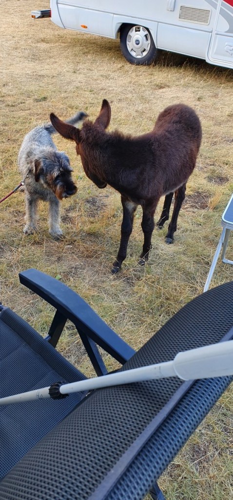 Een uitgestrekte hoogvlakte omringd door bergen. Doet ons haast terugdenken aan de hoogvlaktes in Kirgistan. Midden in de vlakte bij een kiosk een camperplek. Er staan al een twintigtal campers en wij sluiten aan. Al snel krijgen we bezoek. Een stelletje ezels is op zoek naar wat te eten. Hannes vindt het wel spannend.