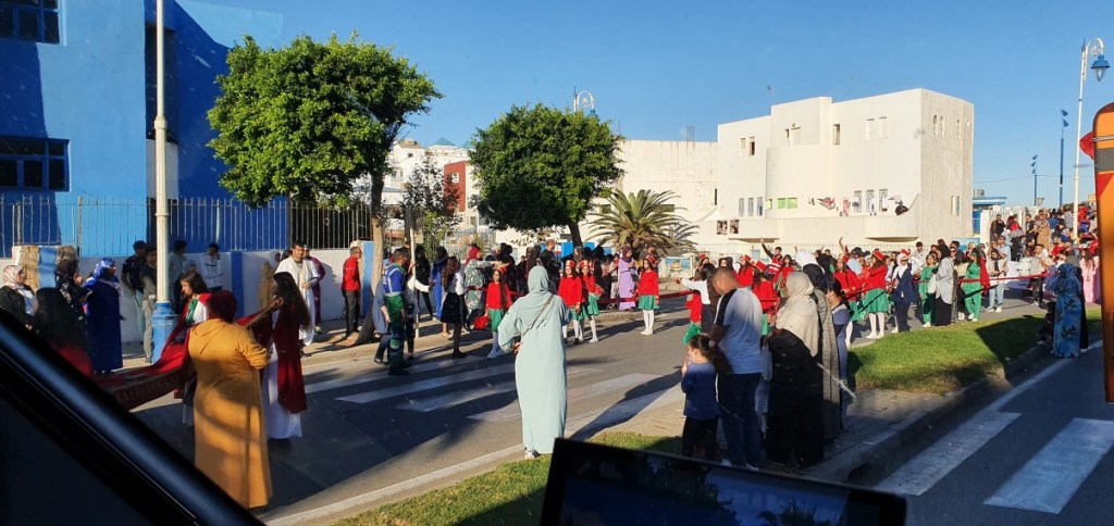 Een spectaculaire route hoog over de bergen leidt ons langs Ceuta, de Spaanse kolonie in Marokko, naar de Afrikaanse middellandse zee kust. Het blijkt een nationale feestdag te zijn en in Fnideq is de weg afgesloten voor een parade. We kronkelen door het binnenstadje, we zijn echt in Afrika! De camperplek bij Cabo Negro ligt bij een hotel en restaurant. ’s Avonds hebben we een gezellig groepseten om met iedereen kennis te maken. In totaal 15 equipes (8 Duits, 6 Zwitsers en 1 Nederlands), waarvan er 3 alleen reizen.