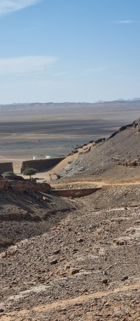 Normaal zou je hier omhoog kunnen rijden, maar helaas, de top van de krater is bezet door een filmset. Er wordt een Franse film gedraaid. Heel surrealistisch is bovenop de berg het wrak van een motorboot neergezet (na de zondvloed?). Het uitzicht vanaf de krater is geweldig. Heel bijzonder zijn de ‘tekeningen’ ontstaan door de autosporen in de wadi.
