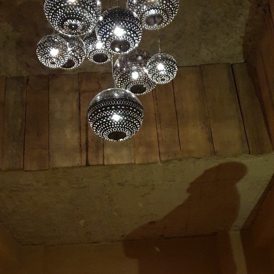 Morgen gaan we de woestijn in, dus Frans laat alvast lucht uit de banden lopen. ’s Avonds hebben we een gemeenschappelijk eten in het hotel en bewonderen we de prachtige binnentuin.