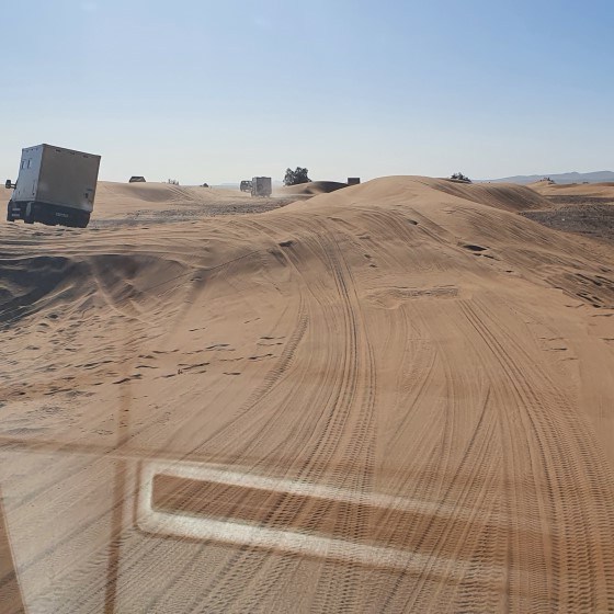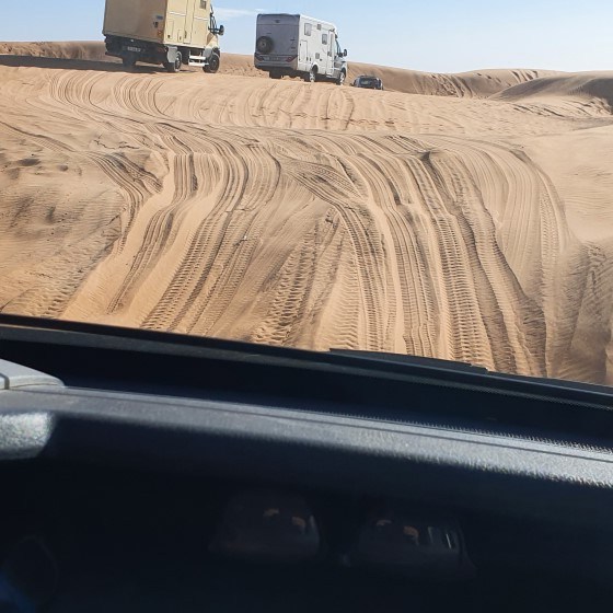 Dan begint het echte werk. De zandduinen zijn net sneeuw. Je glijdt er doorheen. Spectaculair om te doen en te merken dat de auto er gewoon doorheen trekt….
