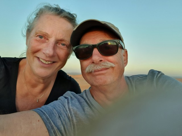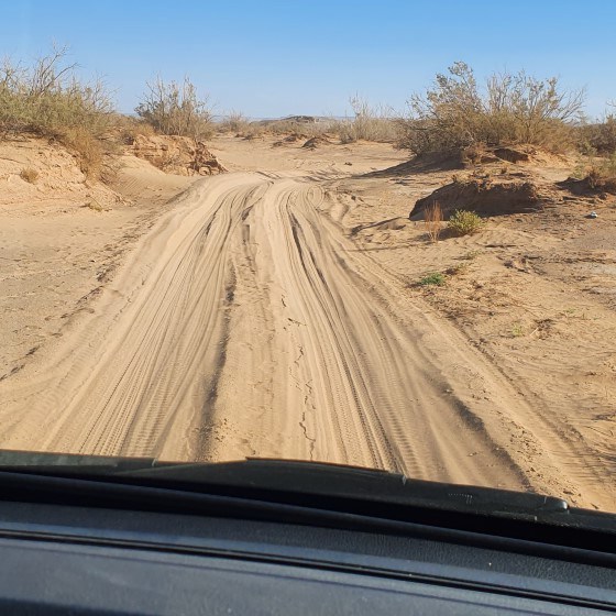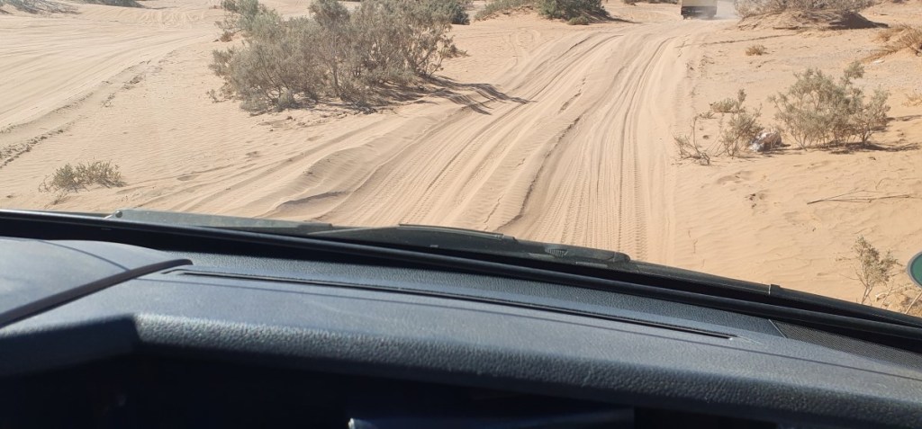 In groepjes van 3 auto’s met een gids voorop gaan we de zandduinen in. Gisteren hebben we al lucht uit de banden gelaten, maar onze gids is nog niet tevreden. Er moet meer lucht uit. Voor van 3.6 naar 1.6 en achter van 4.4 naar 2.2.
