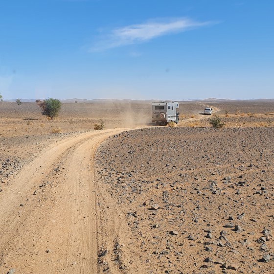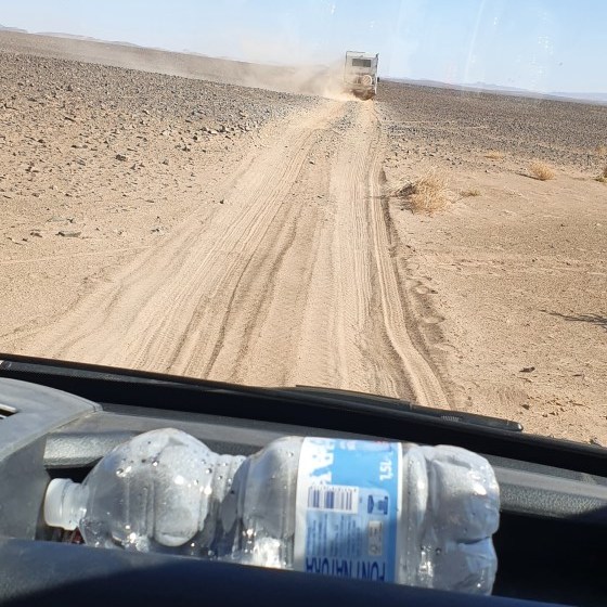 Een deel van de groep gaat door de duinen naar Mharesch. Omdat er in die route een rivierbedding zit met een erg steile op- en afrit is die niet voor alle auto’s geschikt. Wij gaan met de andere groep mee, deels asfalt, deels stenenpiste. Hiervoor moeten de banden weer een stukje opgepompt worden.