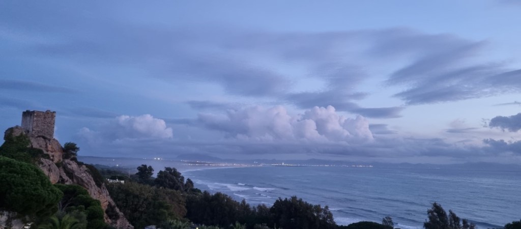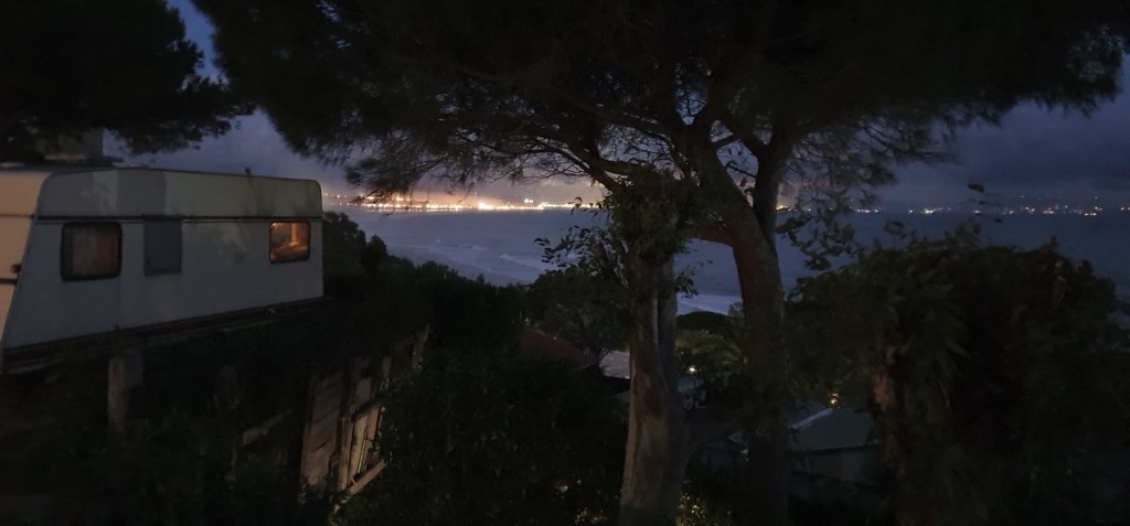 Prachtig plekje op camping Torre de la Pena met uitzicht over de straat van Gibraltar. Aan de overkant (13 km) Marokko. ’s Avonds zie je links de lichtjes van Tarifa (6 km) en recht vooruit Marokko (TangerMed).